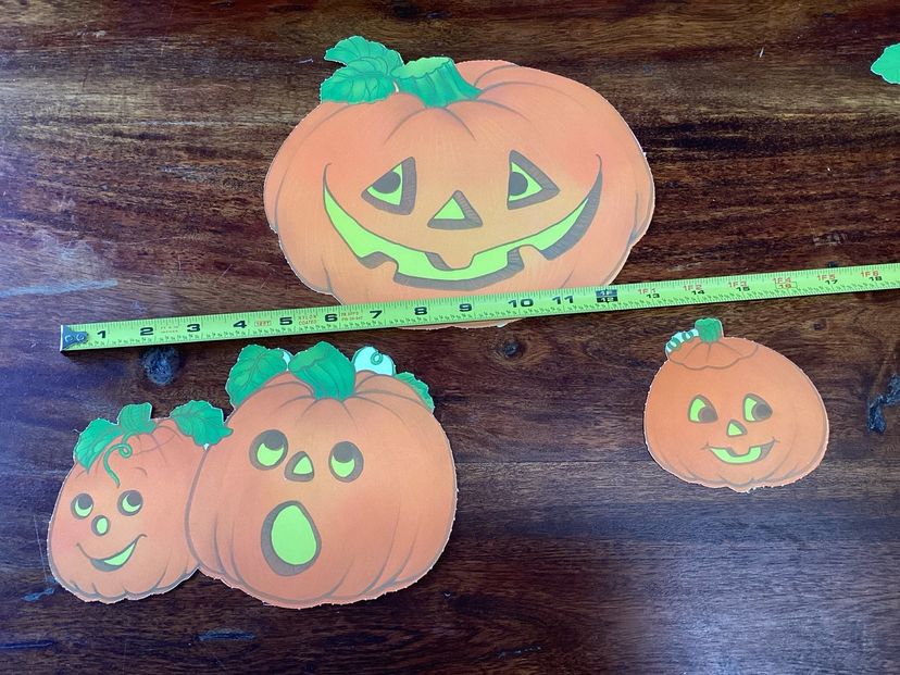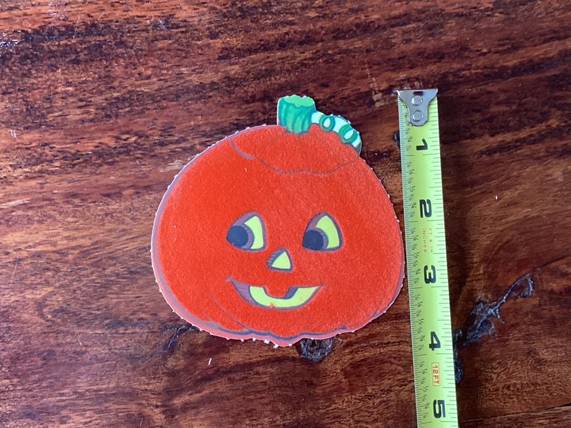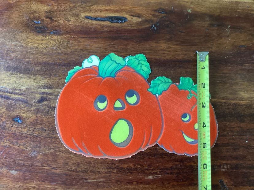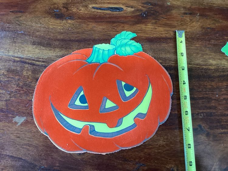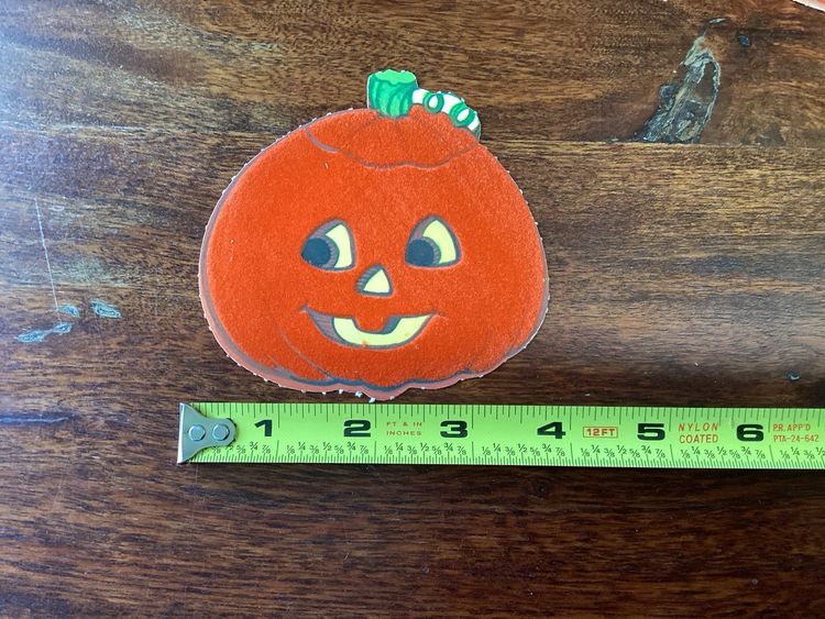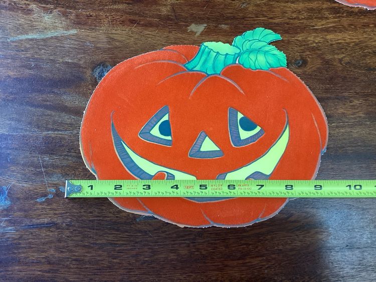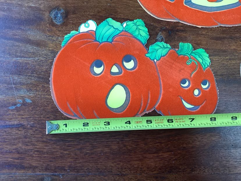 These vintage die cut pumpkins are flocked and were made in the USA in the 1970s. All condition issues are noted in photos. Small is 4x4, medium is 5.5x8.5 and large is 8.5x9.25 in. Please see pictures for a complete description, measurements and condition.