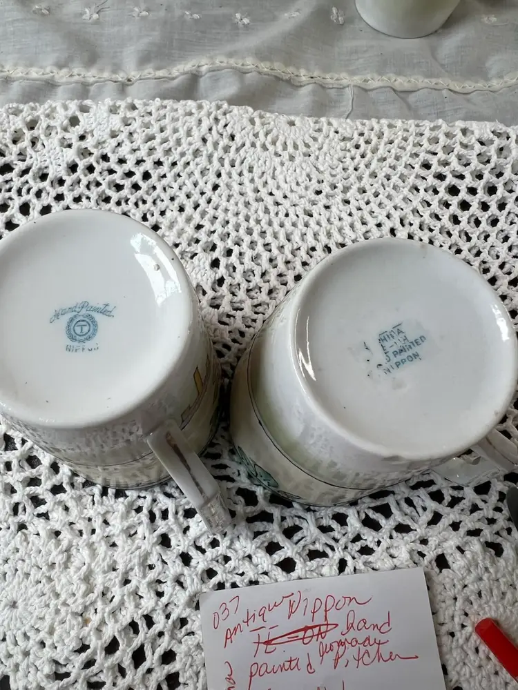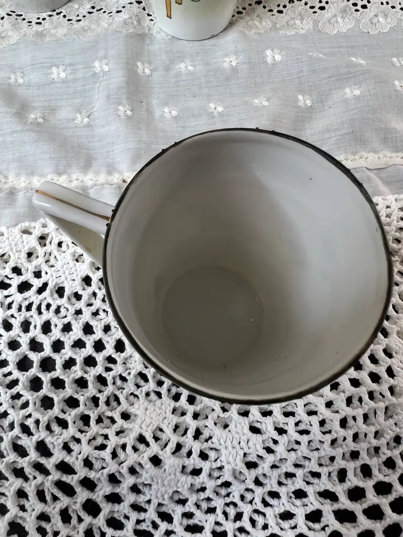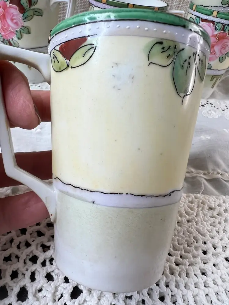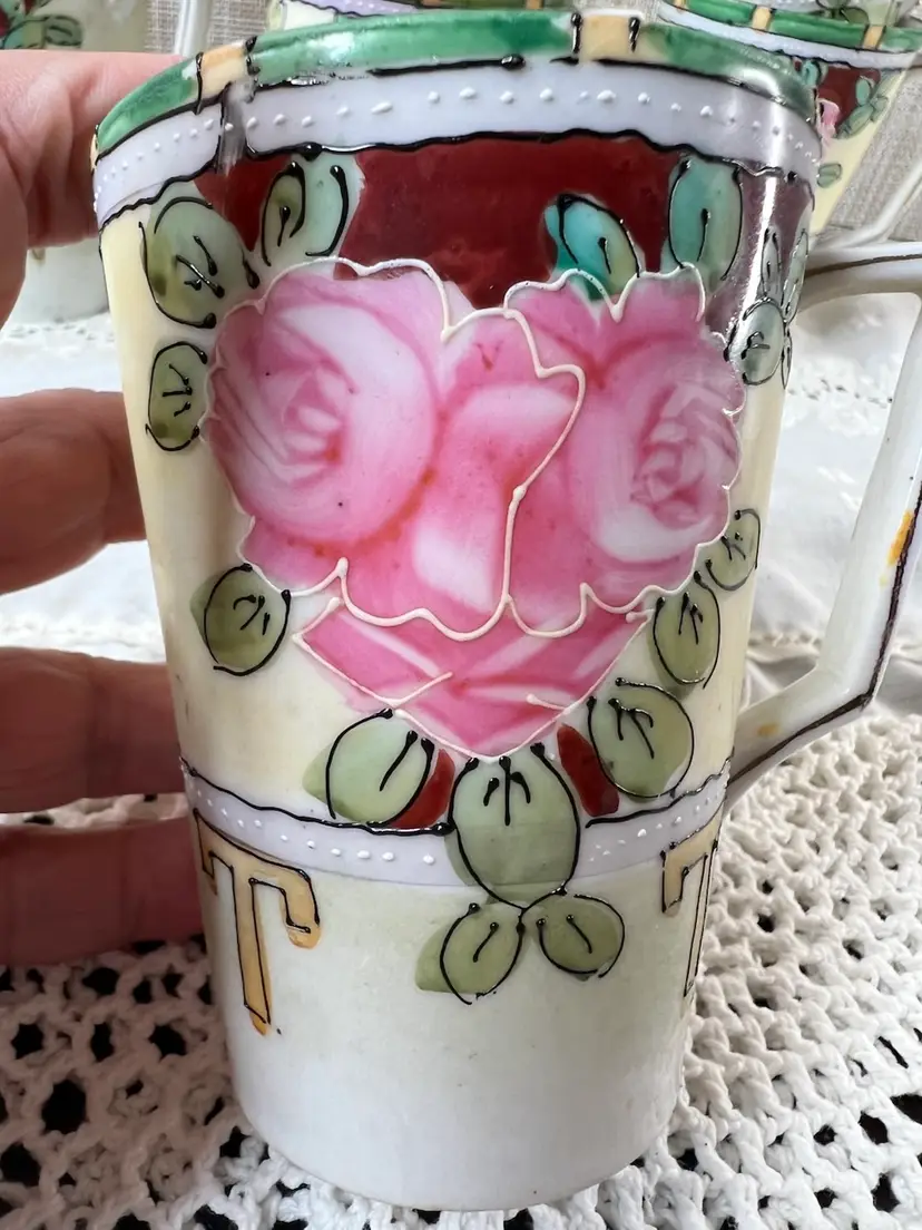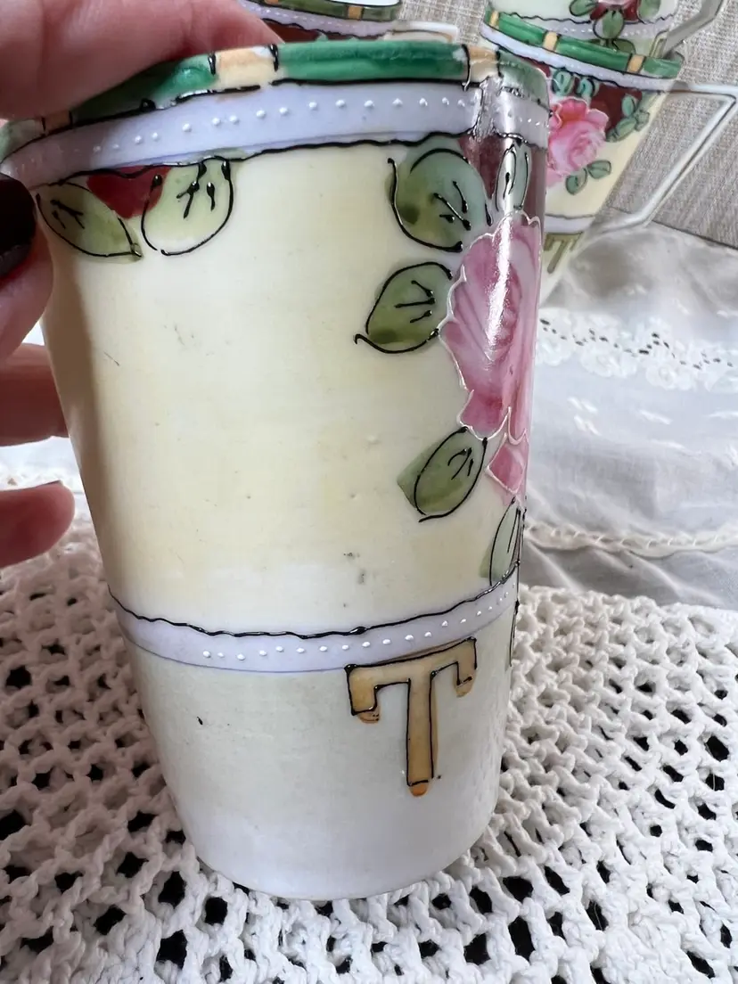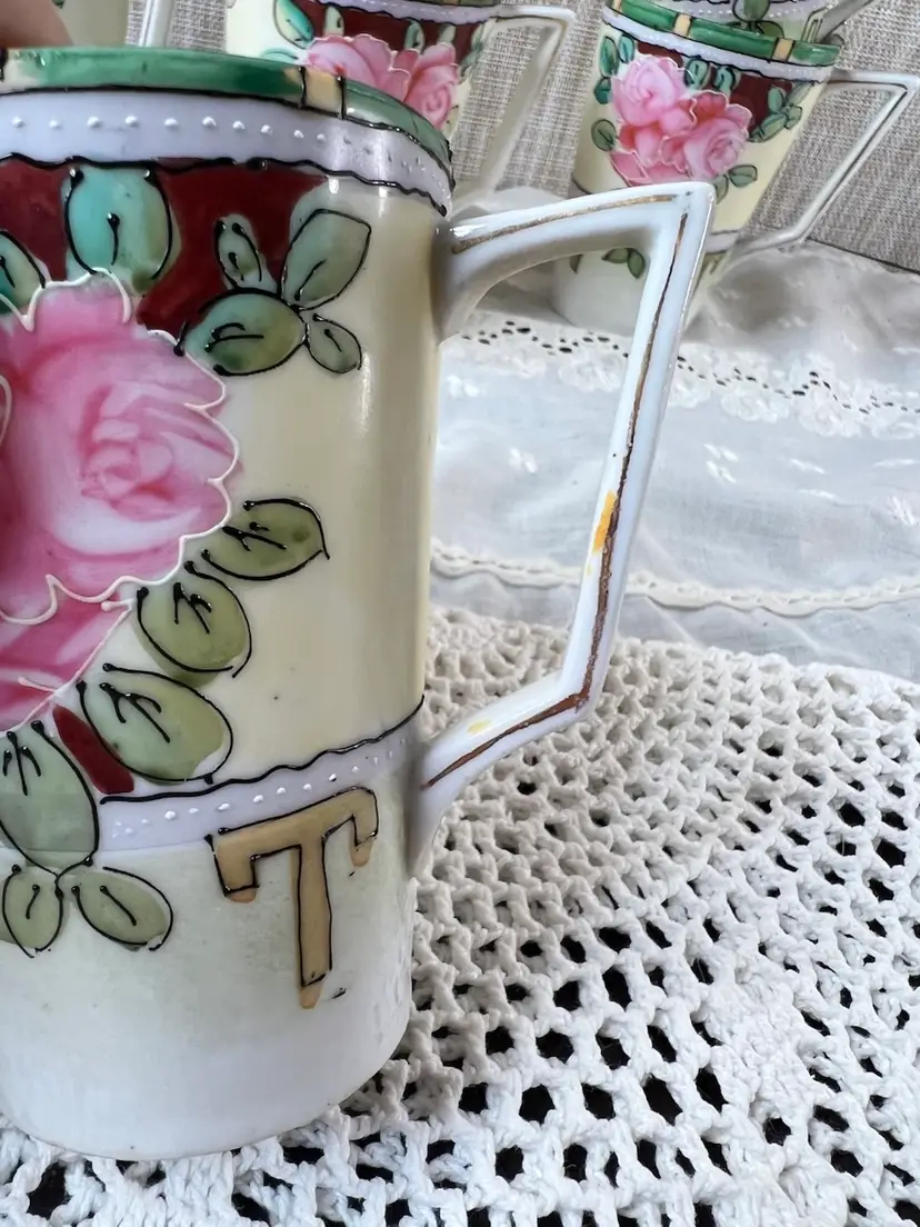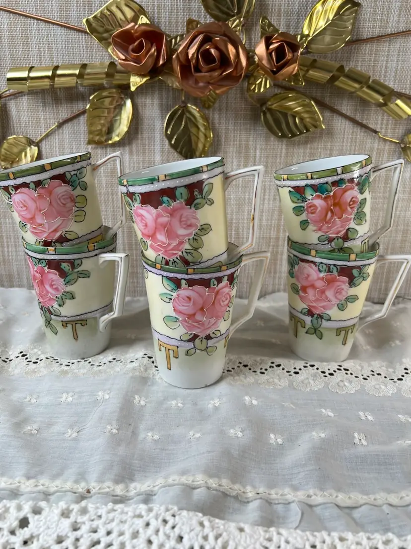 Charming set of vintage porcelain mugs adorned with delicate pink roses and gold accents. Perfect for adding a touch of elegance to your morning coffee or tea ritual. Small chip on bottom of one cup see photos