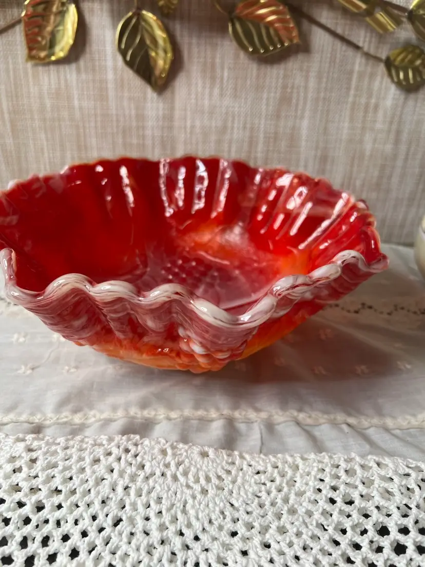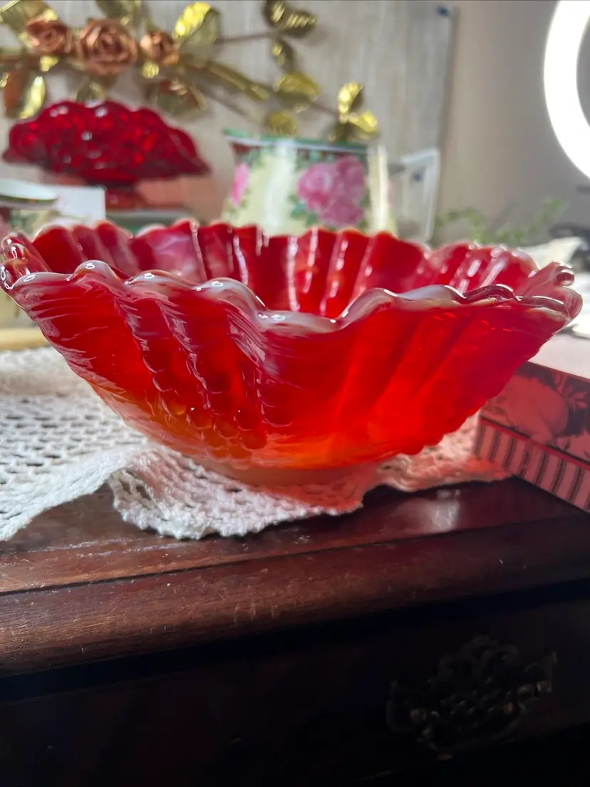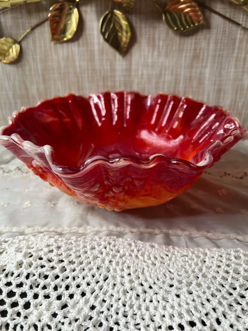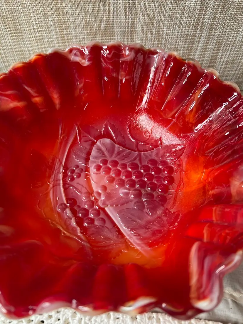 Add a pop of color to your decor with this stunning vintage red carnival glass bowl. Its ruffled edges and vibrant hues make it a standout piece for any table setting or display.