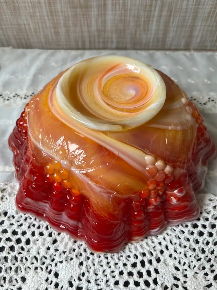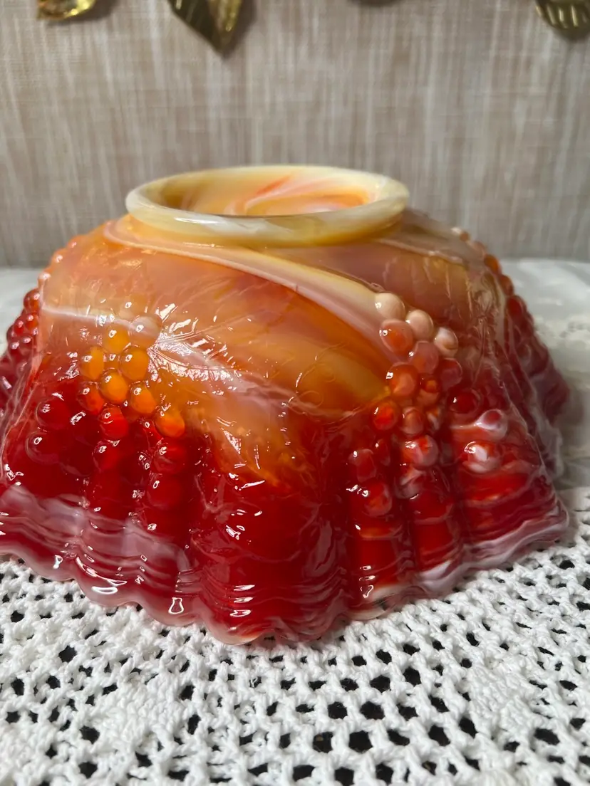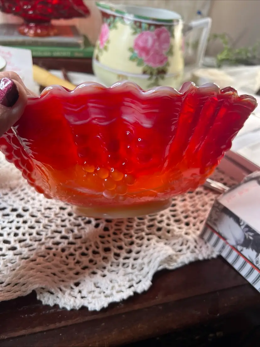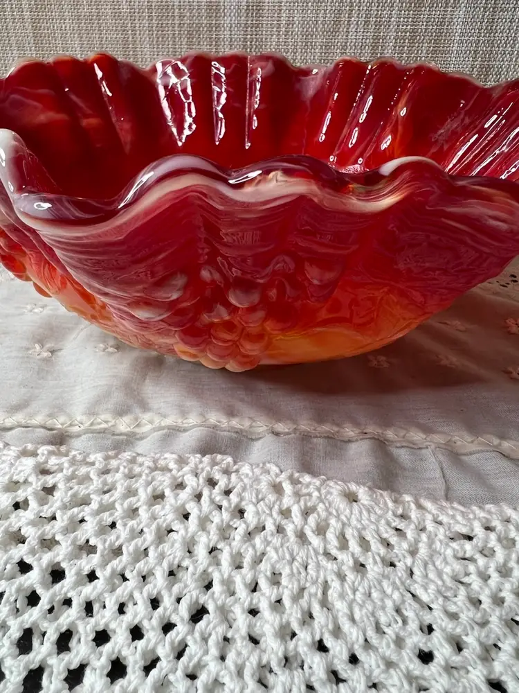Add a pop of color to your decor with this stunning vintage red carnival glass bowl. Its ruffled edges and vibrant hues make it a standout piece for any table setting or display.