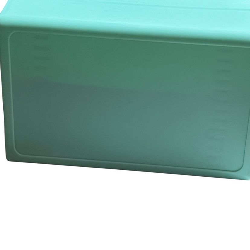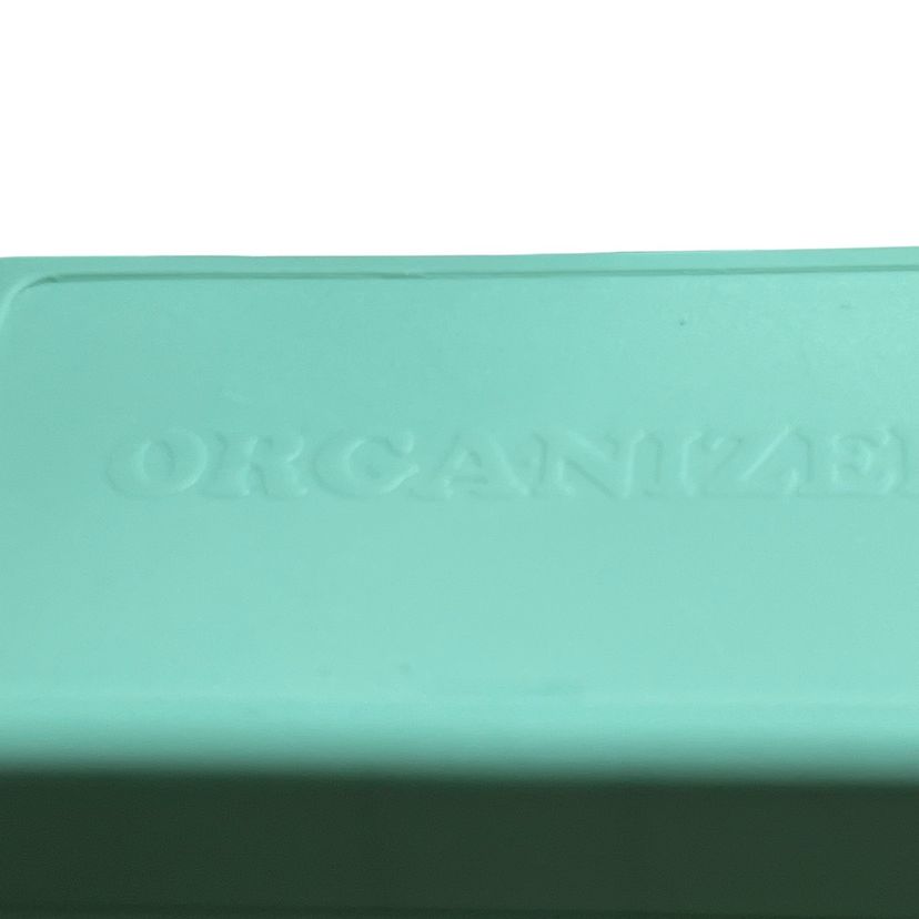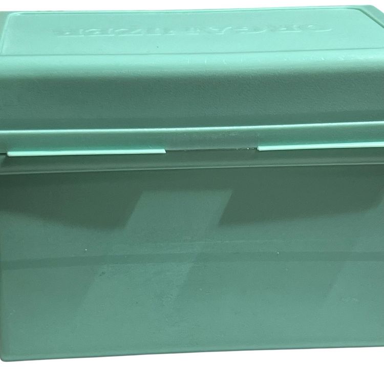 Vintage aqua plastic recipe, organizer box cards and tabs 6.5" x 4" x 5" 1970s.