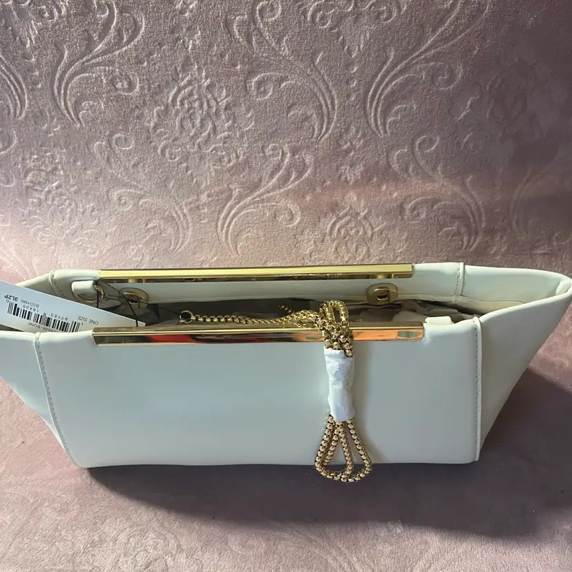 Retail: $40 Hardware: Polished gold-tone metal frame and a removable gold-tone ball chain strap. • Design: Features a structured metal frame with a magnetic closure and soft, synthetic leather exterior panels.