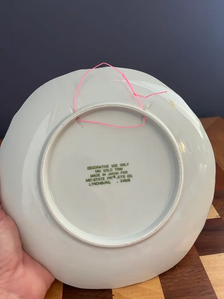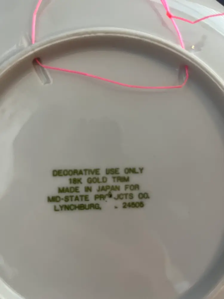 This particular plate, identified as vintage and possibly mid-century modern, originates from Japan, a country known for its porcelain production and export of decorative items. The inclusion of gold trim, specified as 18K, adds a touch of luxury.