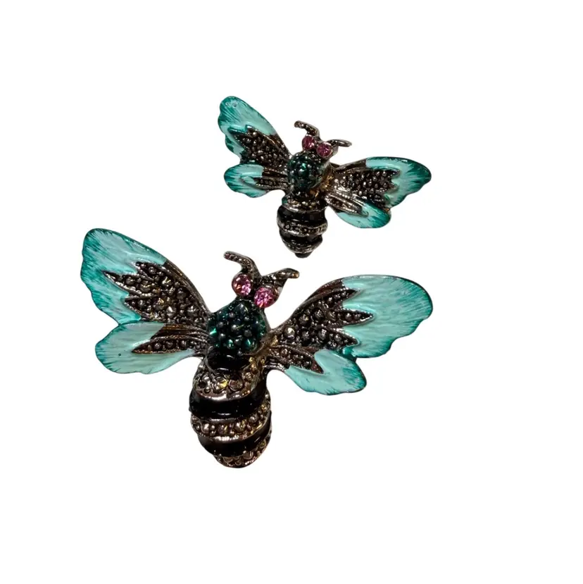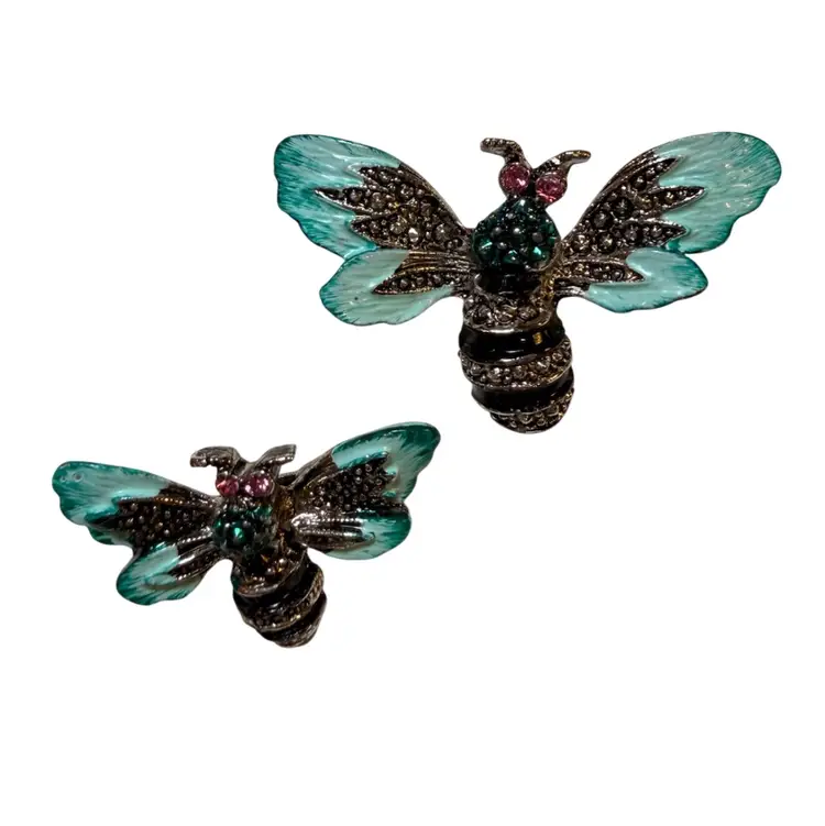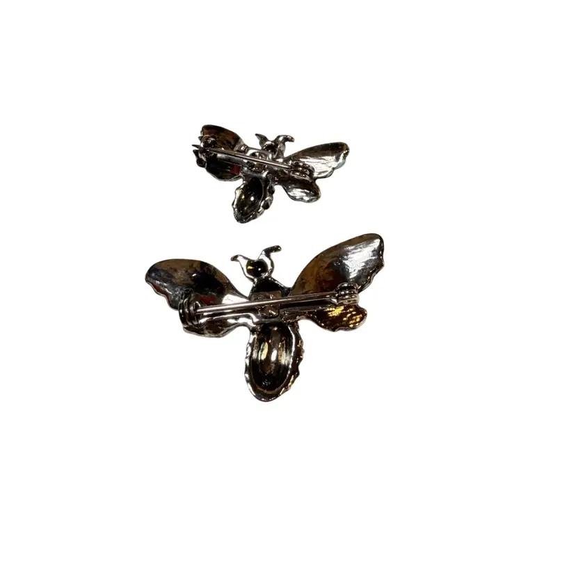2 Vintage Matching Bee Brooches - Enamel, Silvertone And Rhinestones - 1.75” & 1”