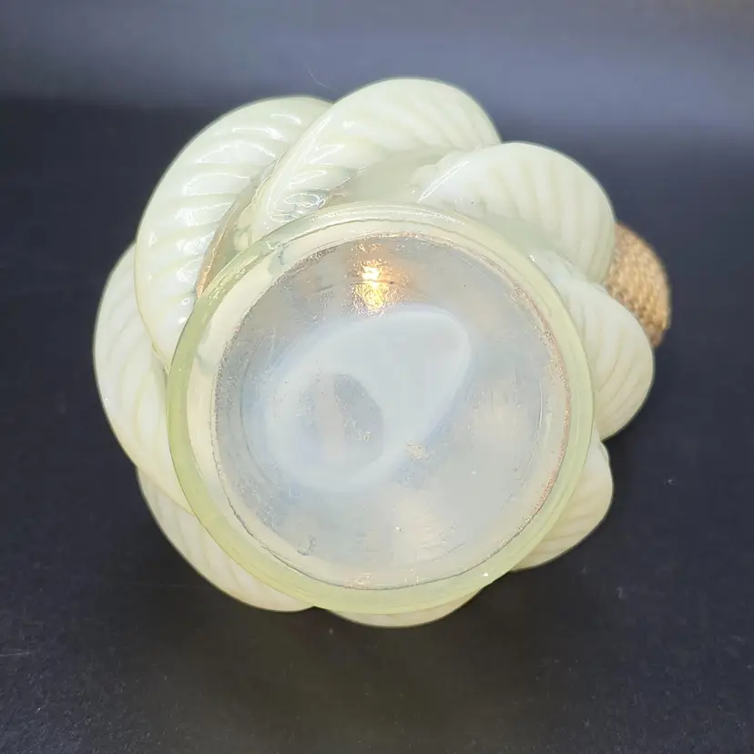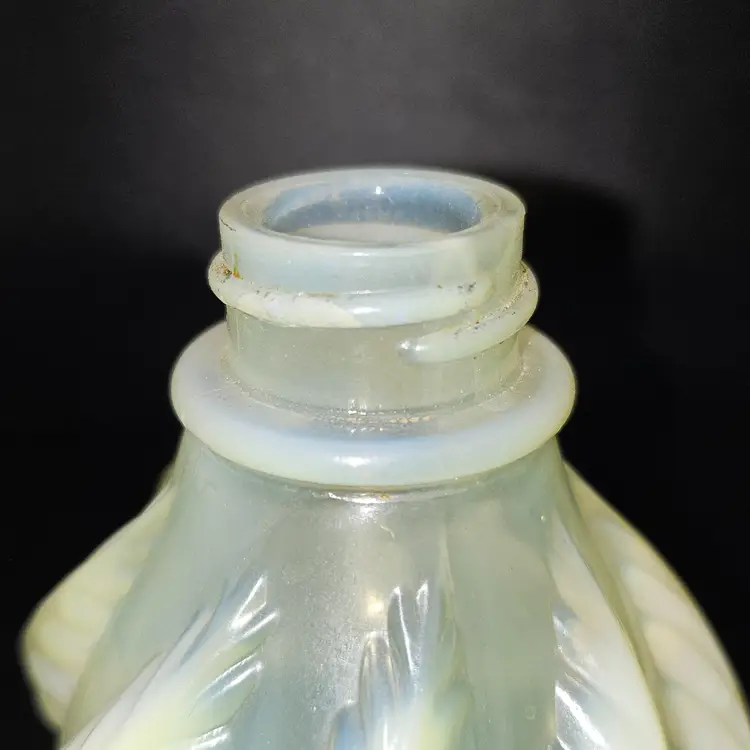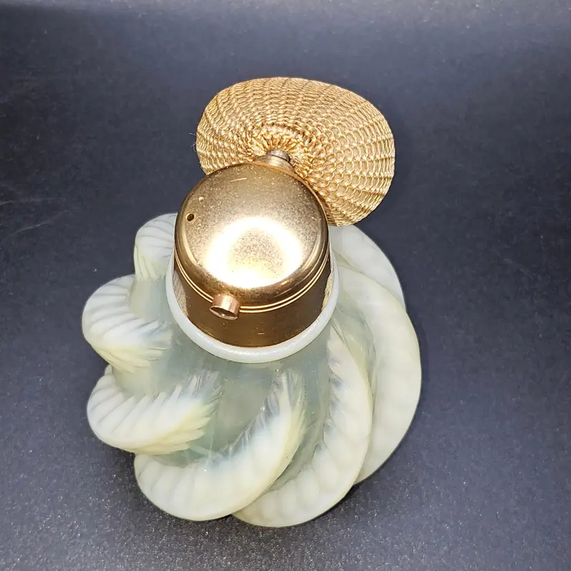 Fenton supplied perfume bottle bases for DeVilbiss starting in 1941. Many of the bottles had opalescent detailing. With the beginning of the United States’ entry into the second World War, production of perfume bottles had ceased at the DeVilbiss plants. Perfume bottles were produced again in 1946, with Fenton's opalescent bottles a popular choice for many ladies.