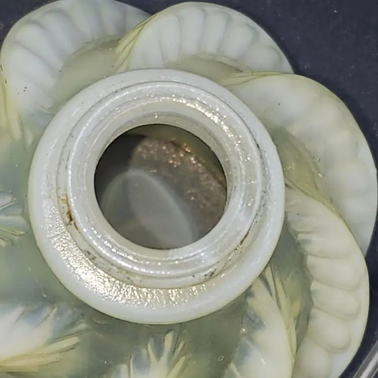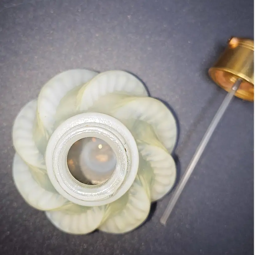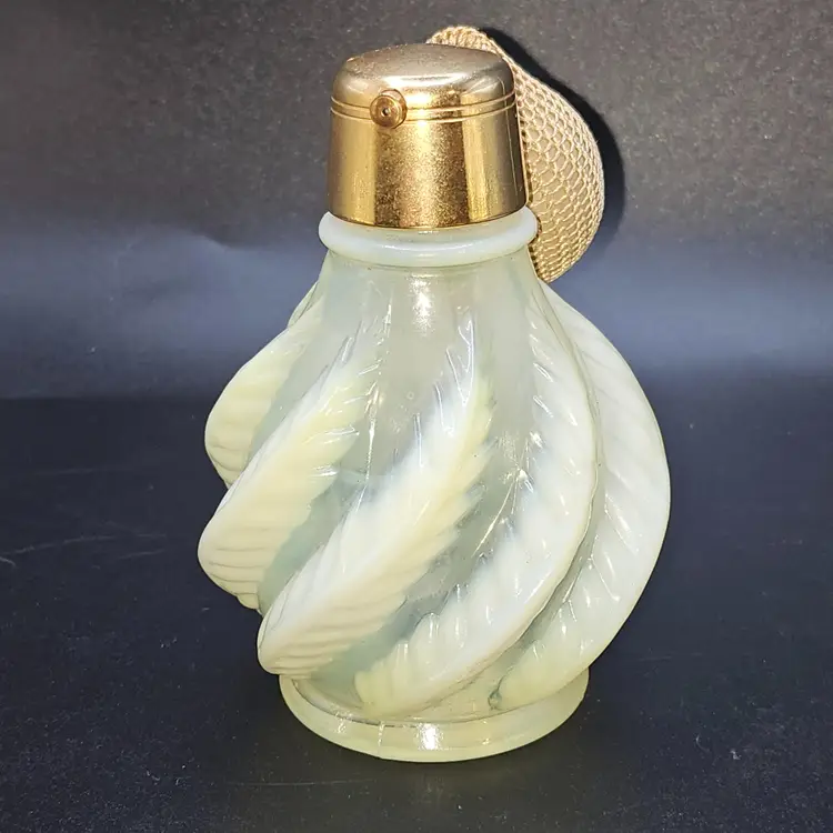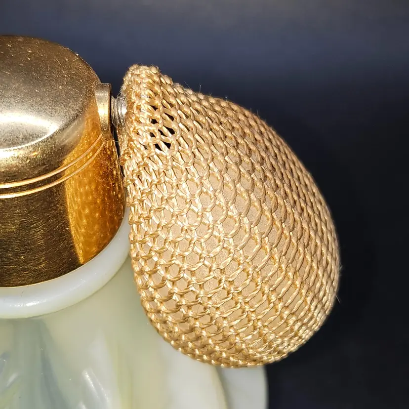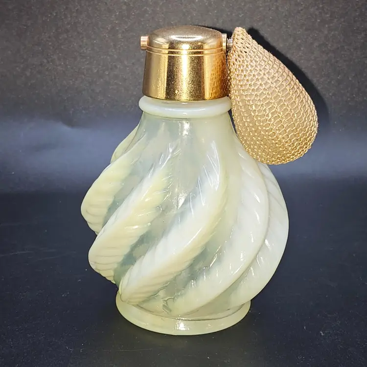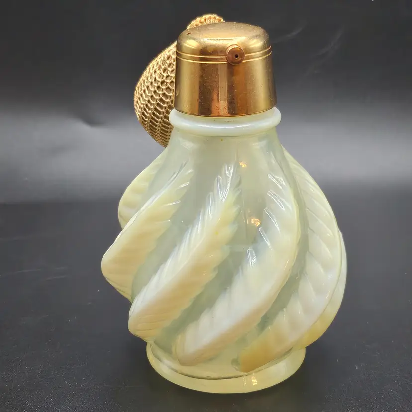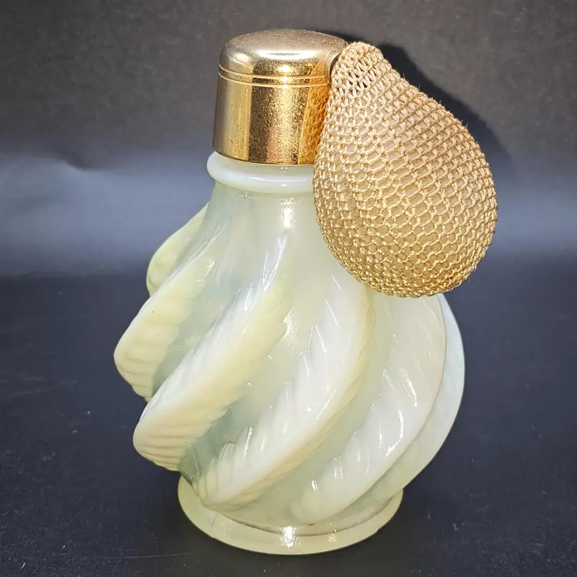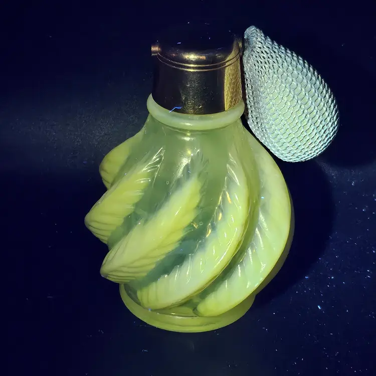 This stunner is in magnificent condition showing little to no signs of age! I want to note that it does have a small fleabite as pictured. Item has the original silk wrapped, hand tied, netted atomizer which has hardened due to age. This is a normal occurance and is not typically considered damage as the bulbs commonly dried out over time. The top and accents on this are plated in 22kt yellow gold, and it has what appears to be, all original parts/pieces. I have done extensive research on this piece and I have put some of my findings below. A lot of people say that this is a Fenton made piece, however, this article somewhat states otherwise. Based on the atomizer, the UV Reactive glow using a 365nm black light (will not glow with a 395nm), and what is found in the article, I believe this piece was made by Cambridge Glass in the 1920s. It is in the color Primrose which is an opalescent yellow and is UV reactive. This also corresponds with the article findings below.
