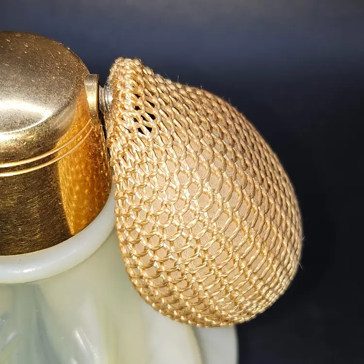 Most of these bottles were made by Cambridge and can be found in the following colors: Azurite (opaque robin's egg blue, introduced in 1922) Primrose (opaque yellow, introduced in 1923) Pomona Green/Avocado (opaque green, introduced in 1920s) Ebony (opaque black, introduced in 1922) Ivory (opaque white, introduced in 1924) Helio (opaque lavender, introduced in 1923) Jade (opaque teal green, introduced in 1924) Crystal (transparent clear) Amber (transparent amber) Light Emerald (transparent green, introduced in 1923) Pink (transparent pink) Topaz (transparent Vaseline, introduced in 1923) Aurora (transparent blue, introduced around 1924) Bluebell (transparent electric blue, introduced in 1926) These can be found plain or etched. The opaque colors are strictly 1920s, the only opaque color that made it into the 1930s was ebony. Many of the pieces are decorated with enamels or gold. These came with hand tied silk netting over their atomizer bulbs. The squat versions stood around 4.25” to 4.5” tall. A 1937 catalog advises that “crystal is in vogue- and crystal predominates the DeVilbiss line.” A very beautiful example is a Lalique styled frosted glass atomizer with tiara-like ornamental intaglio top. Also highlighted in that same catalog are crystal atomizers with large filigree tops studded with glass jewels, which no doubt are of Czech manufacture. Several of the fancier perfume atomizers had cords with tasseled bulbs, a feature not seen in the 1920s.