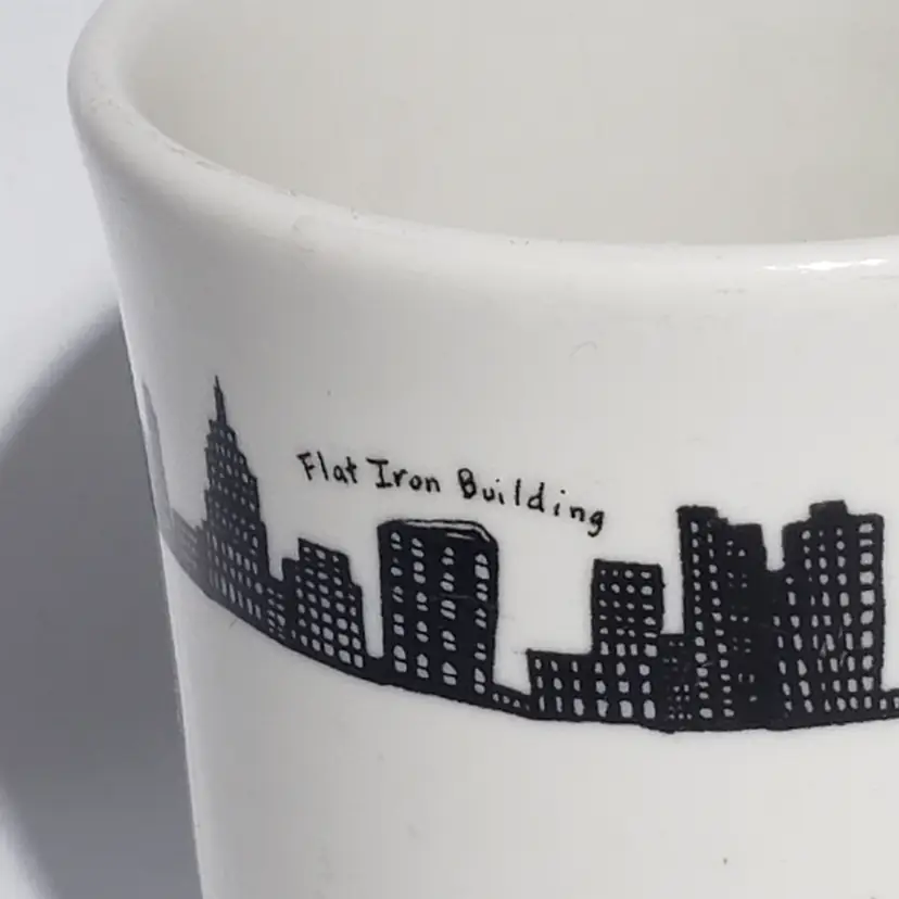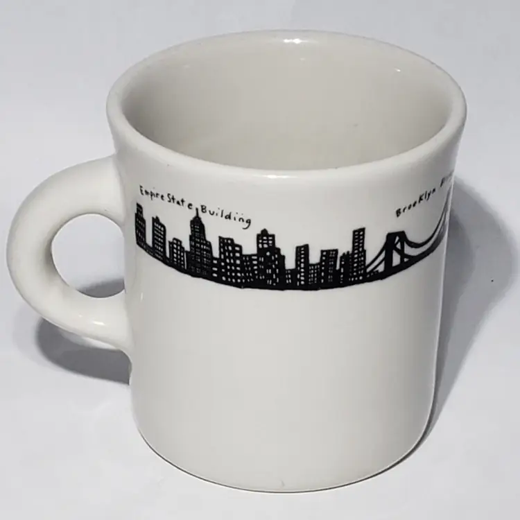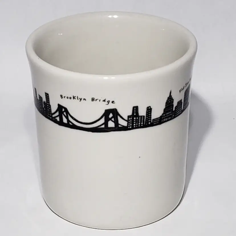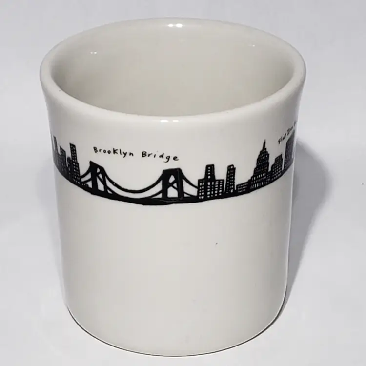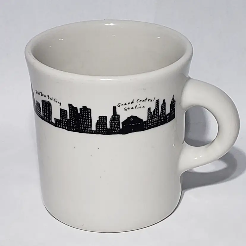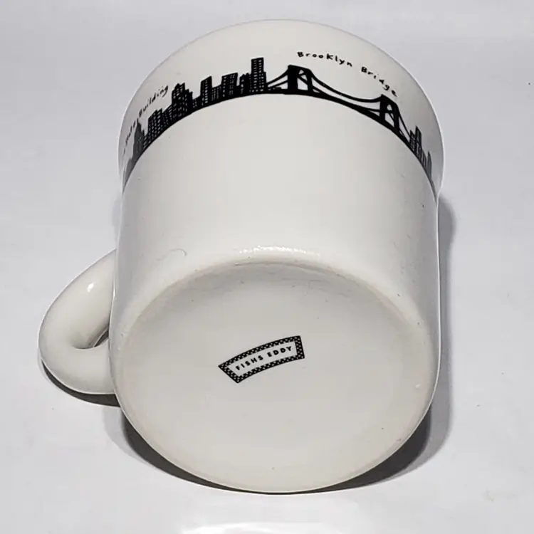 Fishs Eddy New York City NYC Skyline 8 oz Ceramic Diner Mug Empire State Building Brooklyn Bridge Flat Iron Building Grand Central Station Measures: 4" x 3.25" x 3.25" 8 fl oz Pre-owned. No chips or cracks. Wear is present. See Photos.
