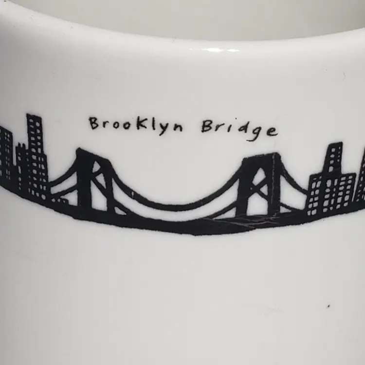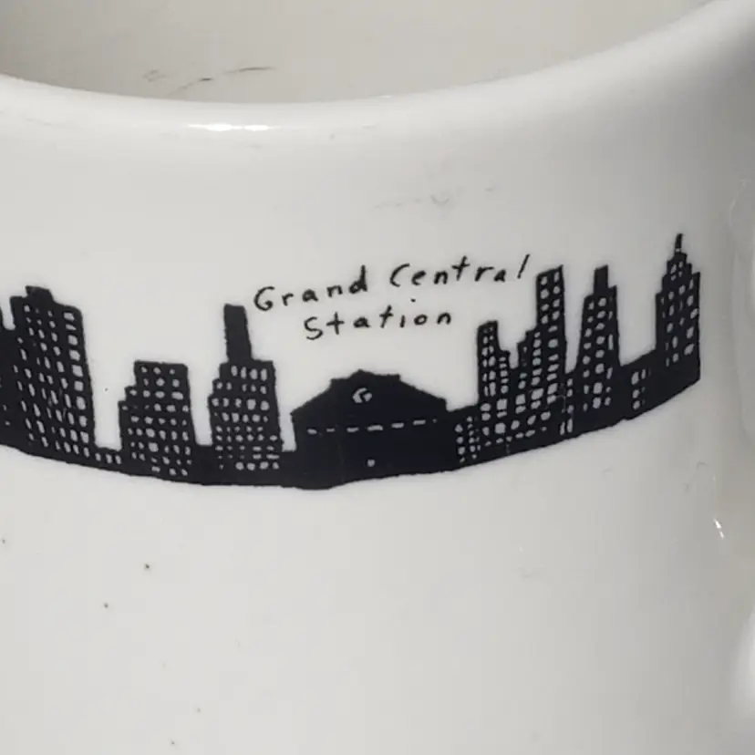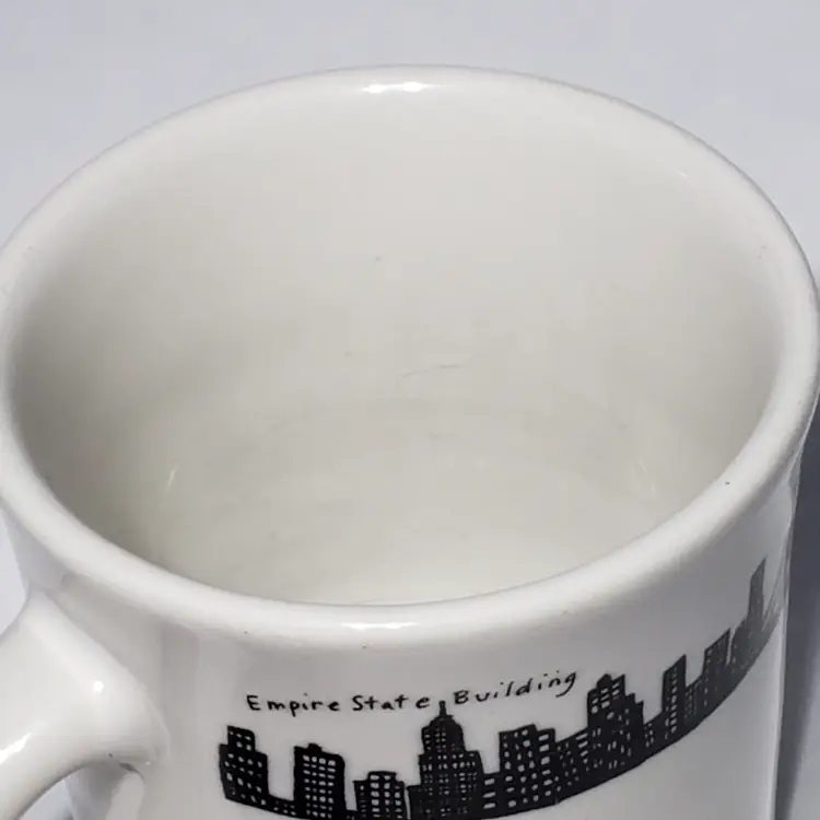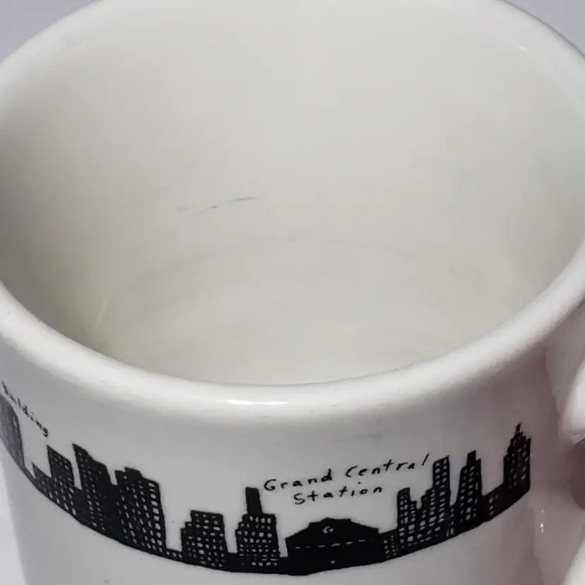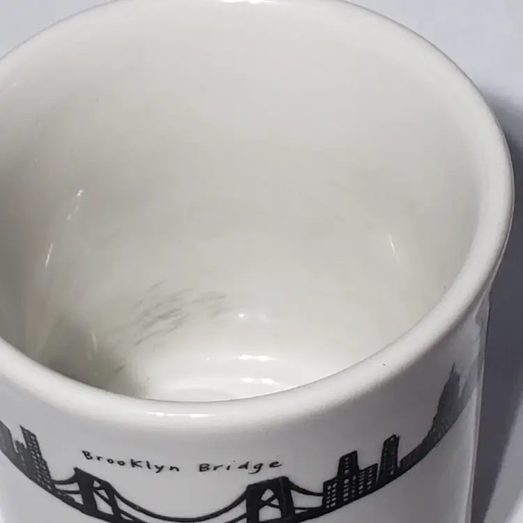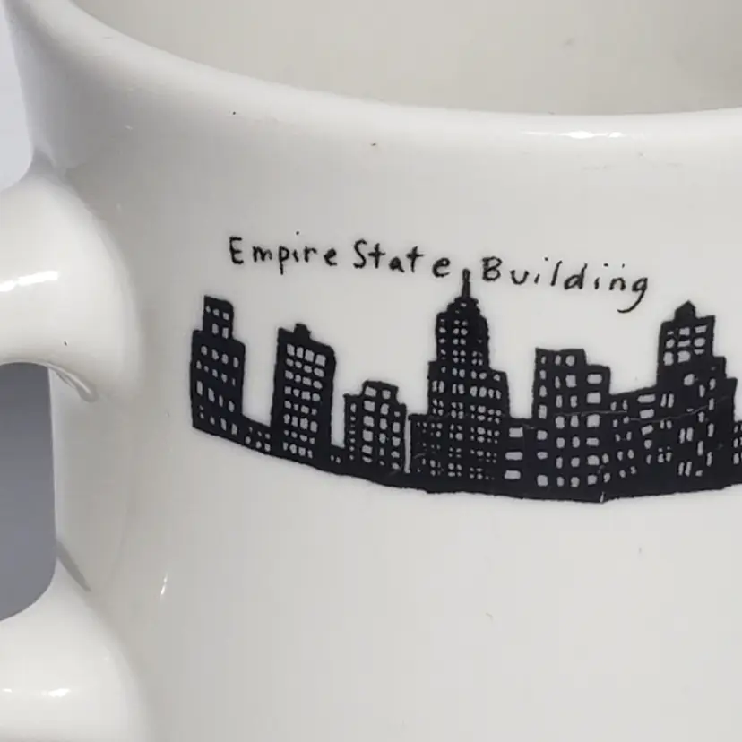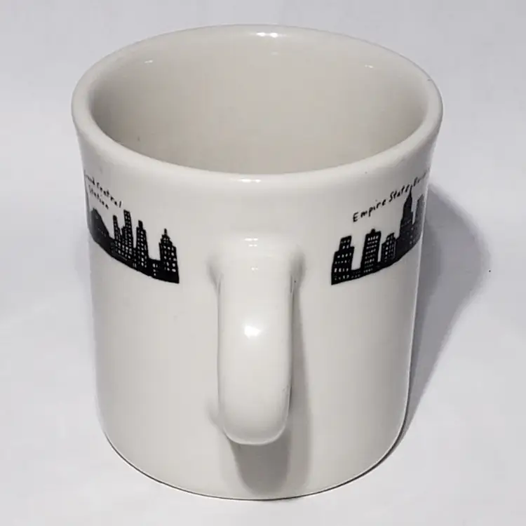 Fishs Eddy New York City NYC Skyline 8 oz Ceramic Diner Mug Empire State Building Brooklyn Bridge Flat Iron Building Grand Central Station Measures: 4" x 3.25" x 3.25" 8 fl oz Pre-owned. No chips or cracks. Wear is present. See Photos.