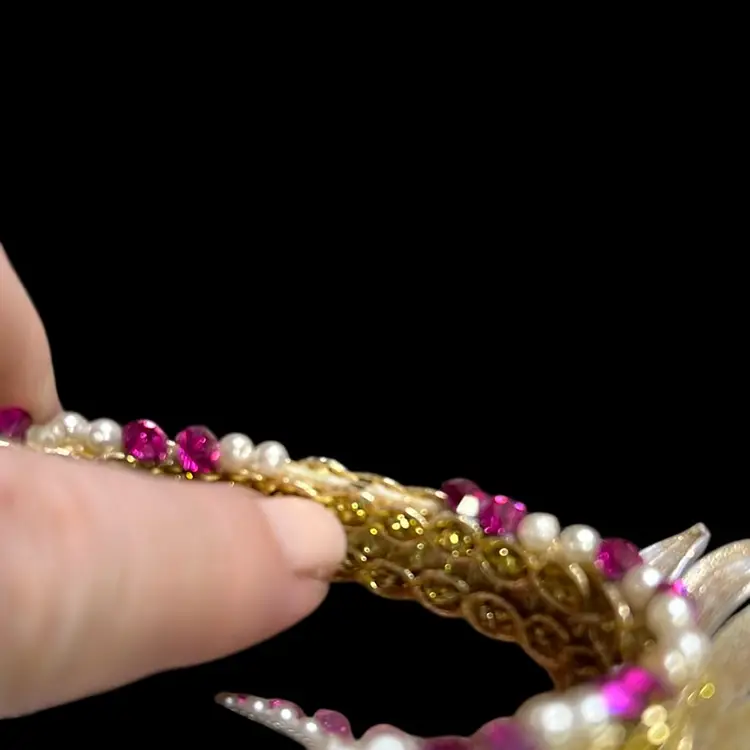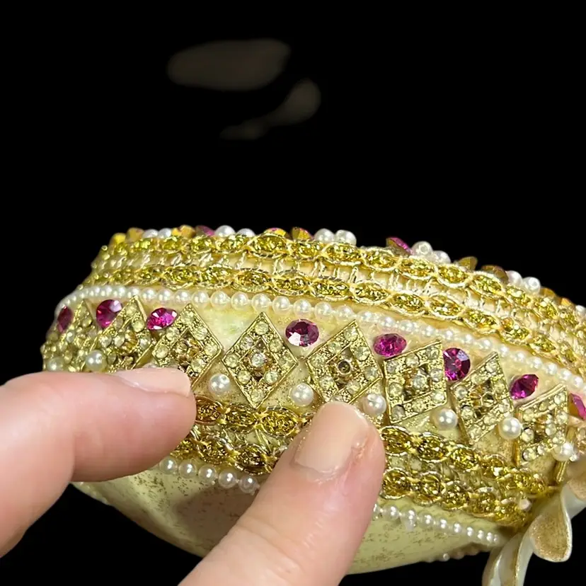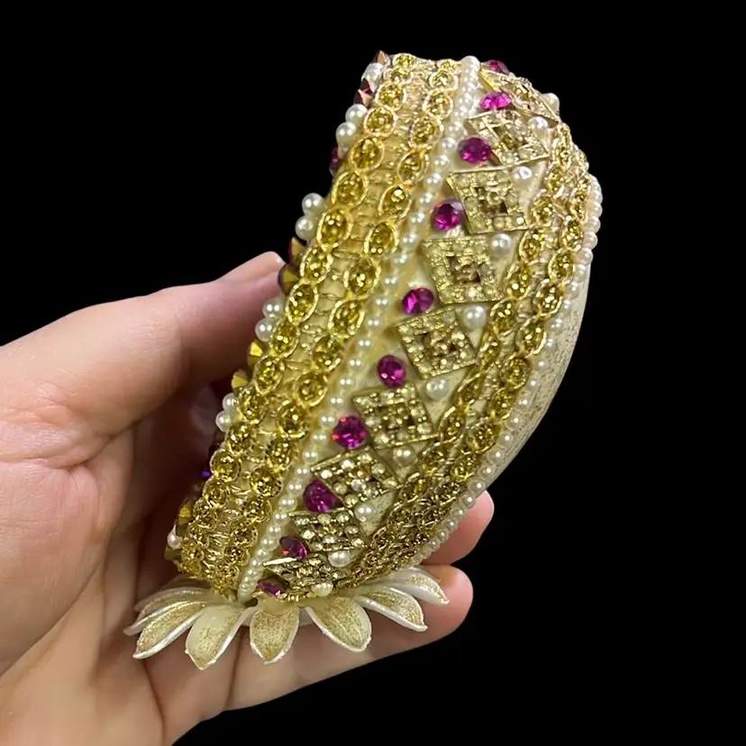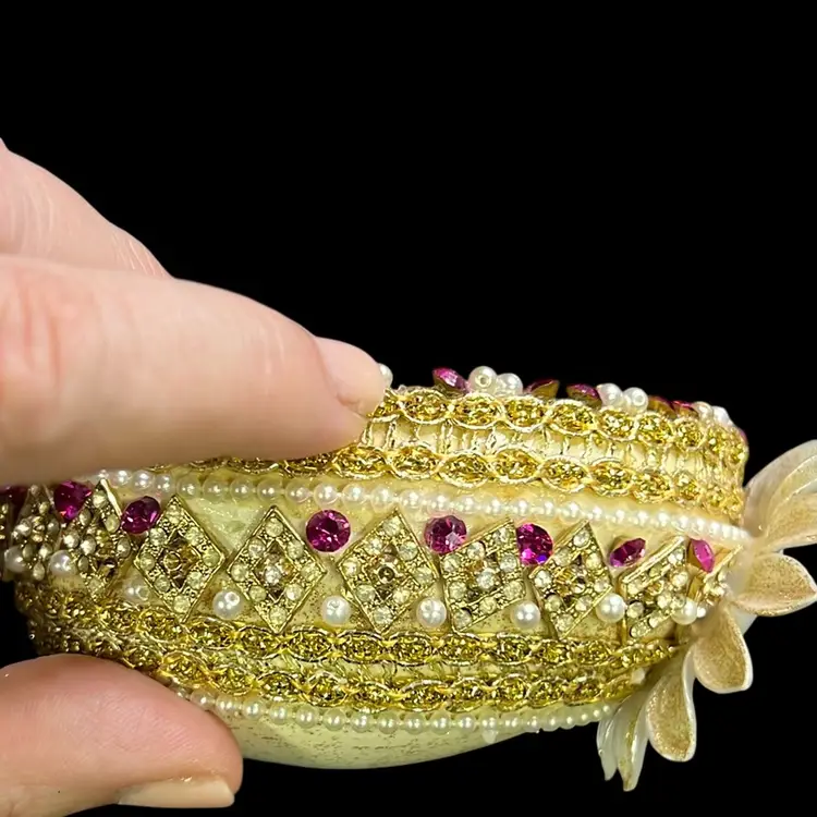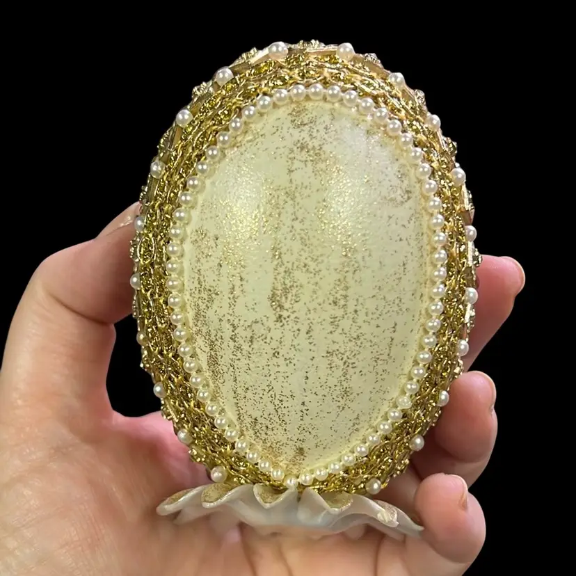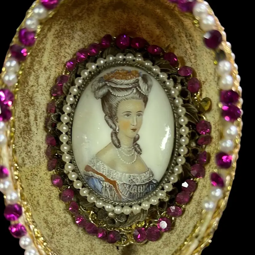 Beautiful portrait of a lady inside an egg. Not sure what material is the egg made or if it is a real egg. But it is beautifully adorned. Some beads and small stones are missing, but no chips or cracks. Please see pictures.