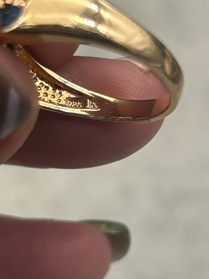 Notable Details • Metal: Gold over Sterling Silver, marked 925 • Stones: Blue Cubic Zirconia • Stone Cut: Round faceted • Setting: Prong-set in double-row design • Ring Size: 10¼ • Band Width: Approx. 7 mm • Style: Band / Cocktail / Statement • Condition: Excellent — bright gold finish, secure stones, light wear consistent with age