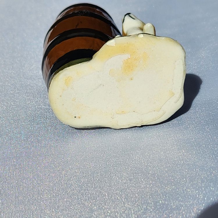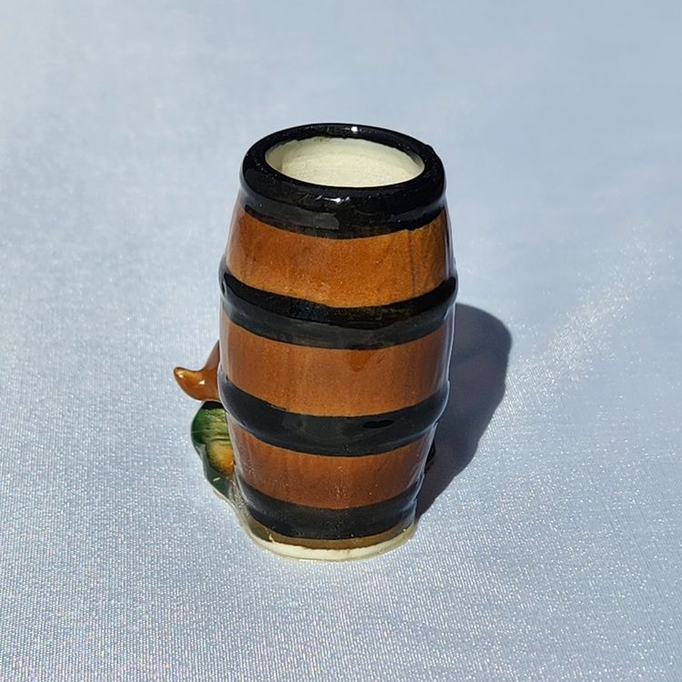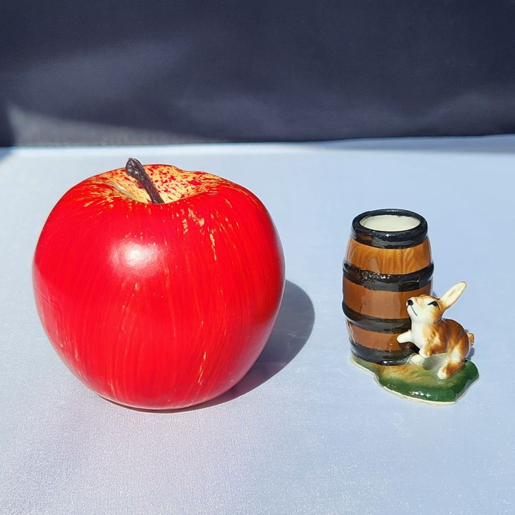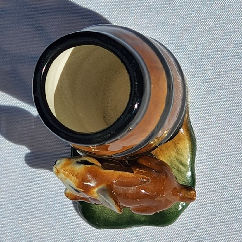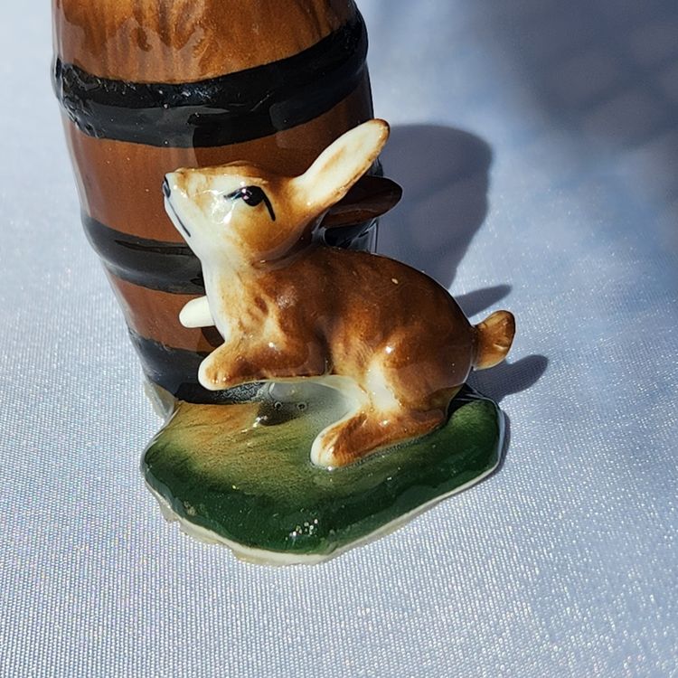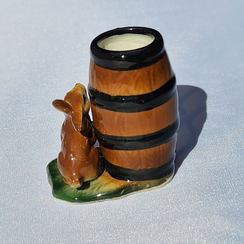 Adorable multipurpose small vase / toothpick/ hatpin holder with a tiny rabbit figurine attached. These are Japanese, made mid century, I couldn't believe that he has survived all this time with his ears intact! Designed as a toothpick holder today they are used for many purposes like a mini vase/faux succulent or flower holder. It's uses are as varied as your imagination it would be so fun on your Easter dinner table. Appears to be porcelain or bone china.