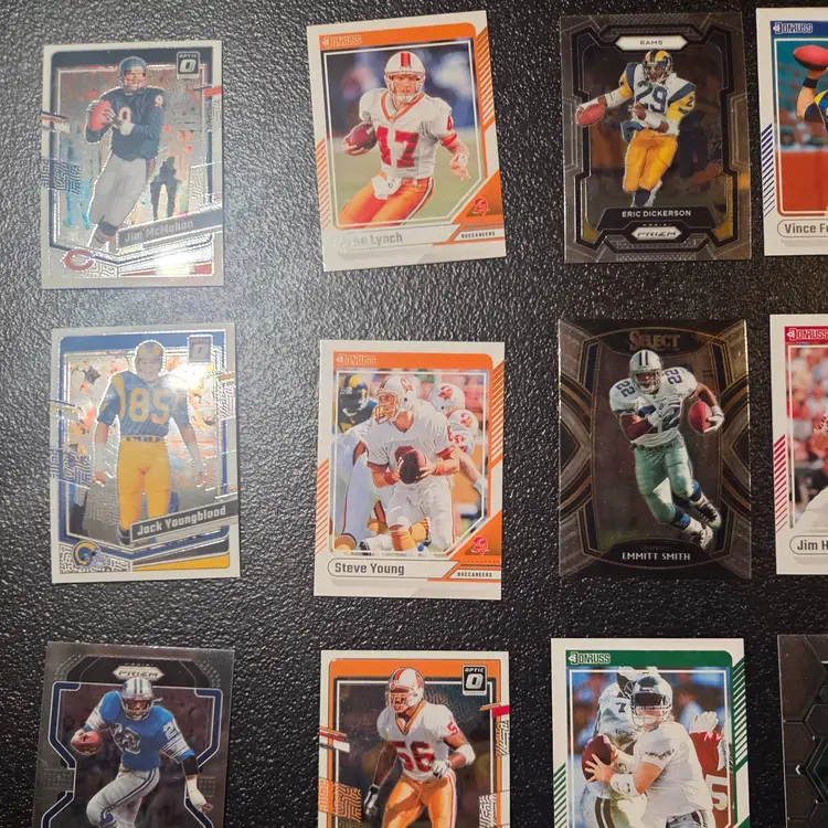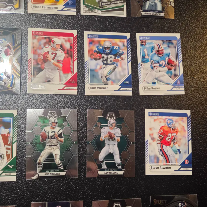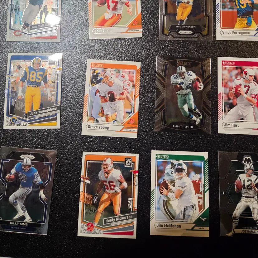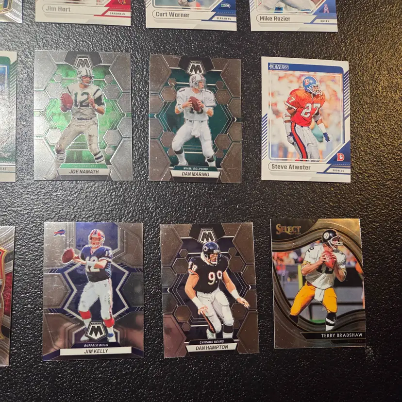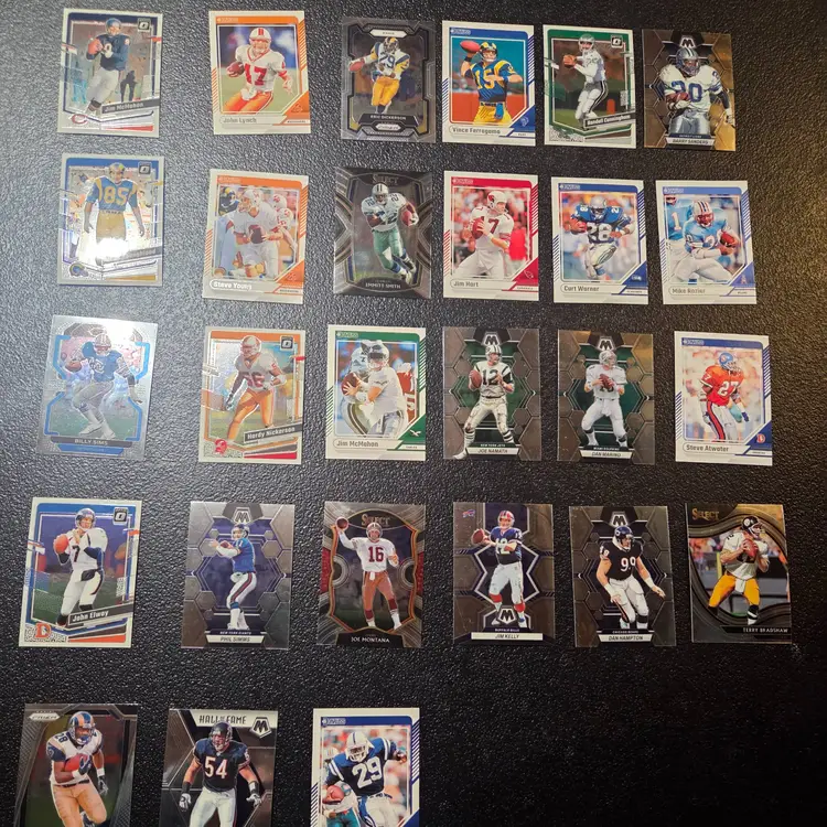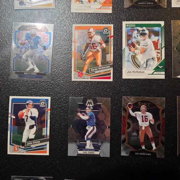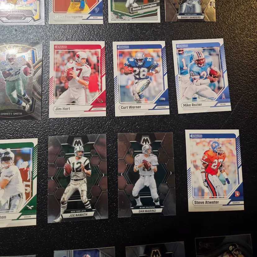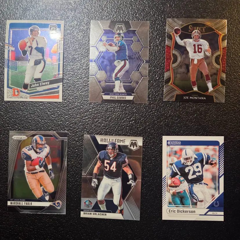 Jim McMahon - Bears John Lynch - Buccaneers Eric Dickerson - Rams Vince Ferragama - Rams Randall Cunningham - Jets Barry Sanders - Lions Jack Youngblood - Rams Steve Young - Buccaneers Emmett Smith - Cowboys Jim Hart - Cardinals Curt Warner - Seahawks Mike Rozier - Houston Oilers ( Eventually became the Tenessee Titans) Billy Sims - Lions Hardy Hickerson - Buccaneers Jim McMahon - Jets Joe Namath - Jets Dan Marino - Jets Steve Atwater - Broncos John Elway - Broncos Phil Simms - Giants Joe Montana - 49ers Jim Kelly - Bills Dan Hampton - Bears Terry Bradshaw - Steelers Marshall Faulk - Rams Brian Urlacher - Bears (Hall of Fame Card) Eric Dickerson - Colts