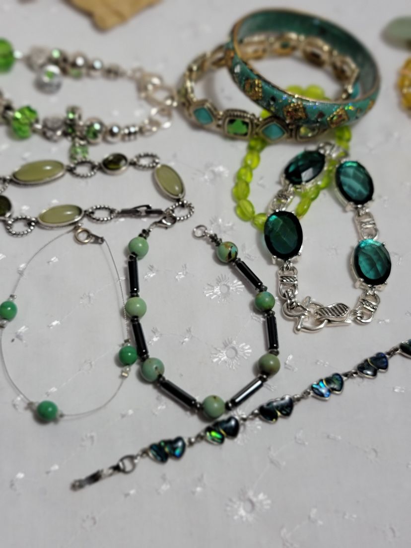*Lots of Necklaces some are Maker marked, Handmade bracelets with semi precious gemstones also rings, earrings and brooches 2 1/ 2 lbs of gorgeous green!