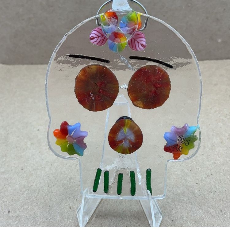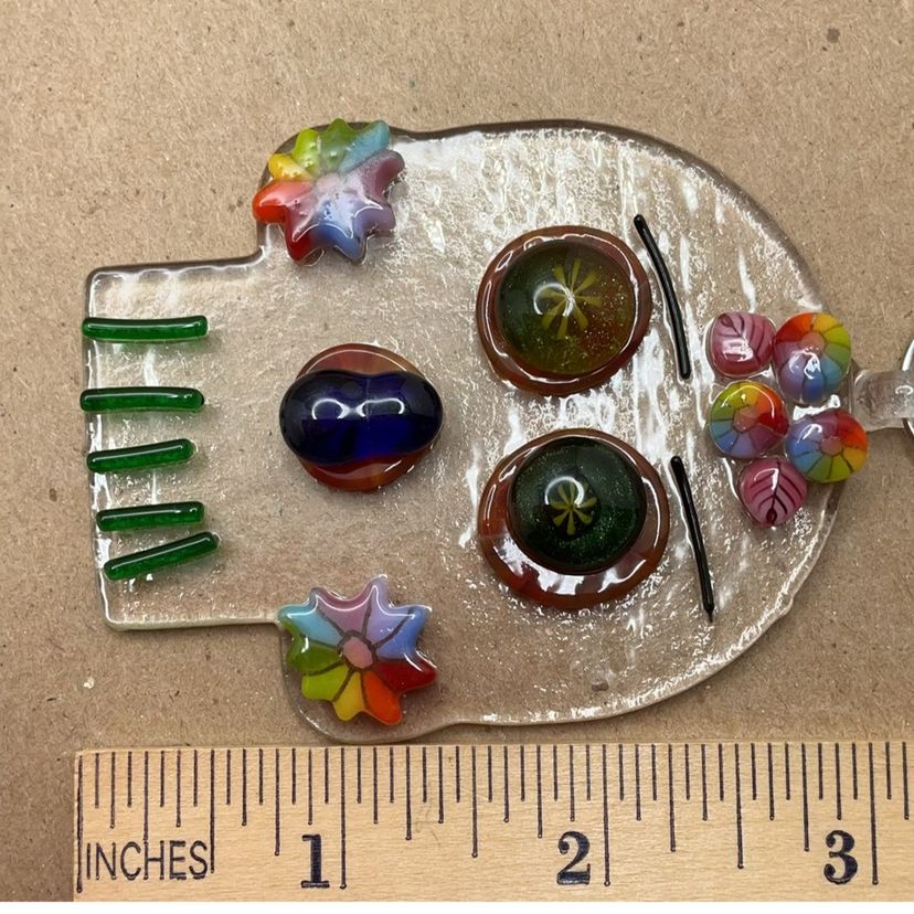Ornament, kiln made with love by me! Unique and varies in color placement, bubbles and depth of field. Shiny on the front, textured on the back, approximately 3” x 2.-inches. Made with Bullseye glass and elements from a variety of other glass artists.