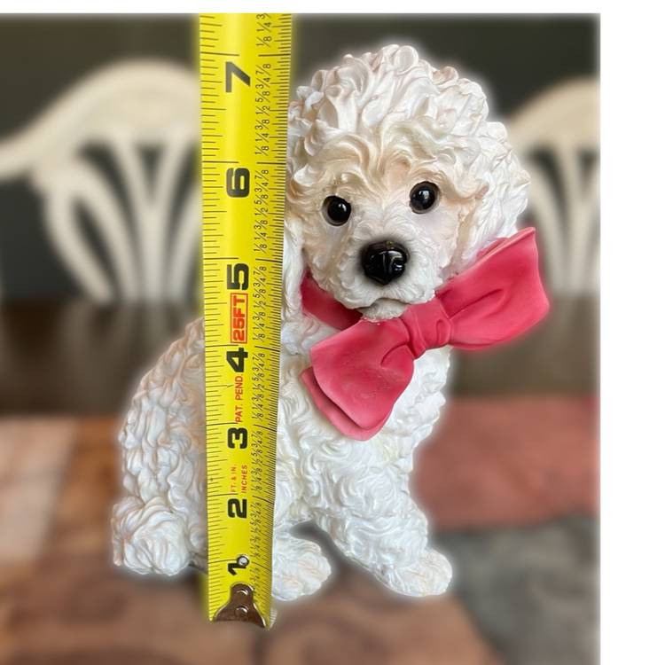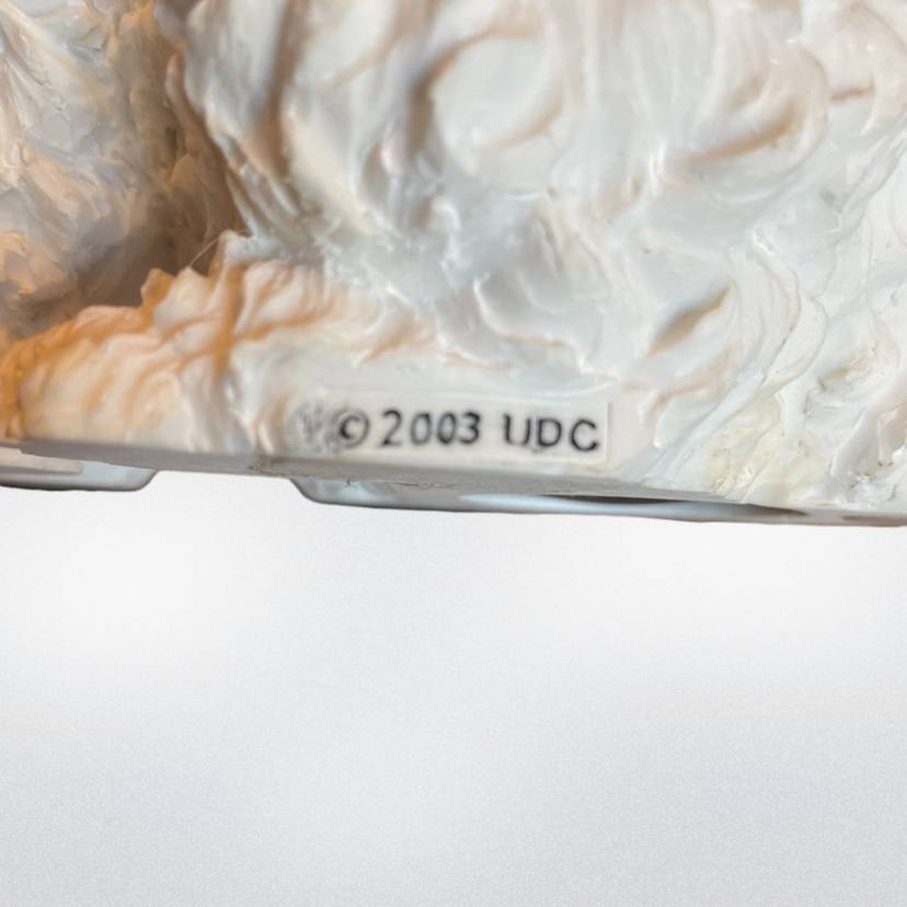 Good condition , I believe it's made of resin. The eyes are so real looking and that's how I ended up with her...