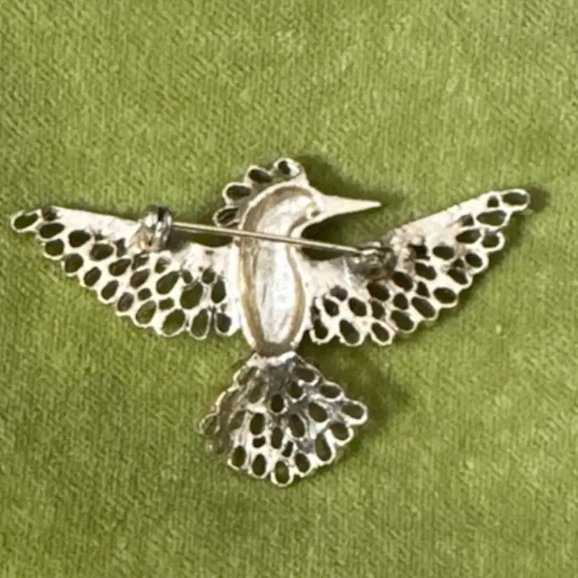 Beautiful gold tone open work on wings,tail and head. Clear glass rhinestones on wings and body. Red rhinestone eye. Amazing vintage condition. Measures 2 1/2 inches across.