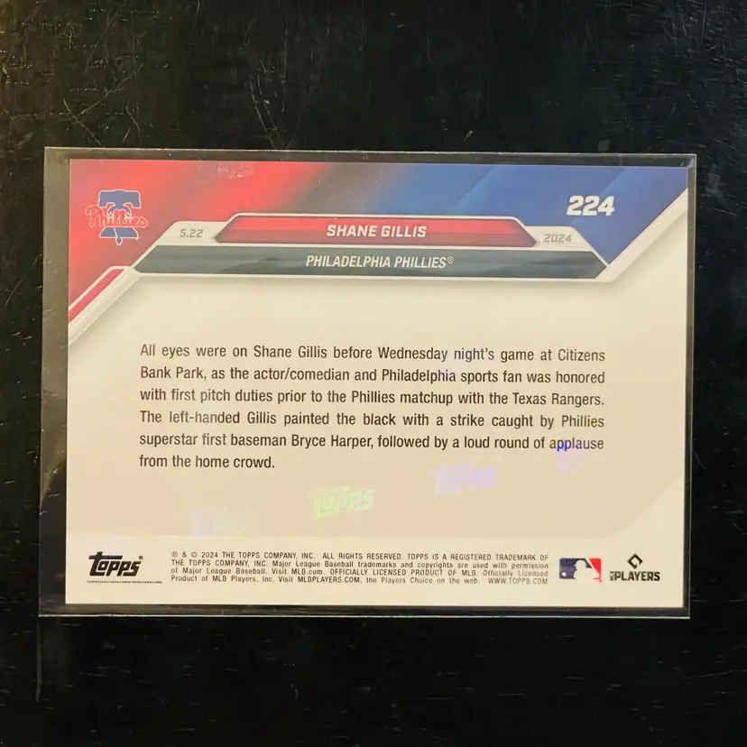 Add this unique Topps Now card featuring actor/comedian Shane Gillis tossing a strike before the Phillies' win to your collection. A great piece for any Shane Gillis fan!