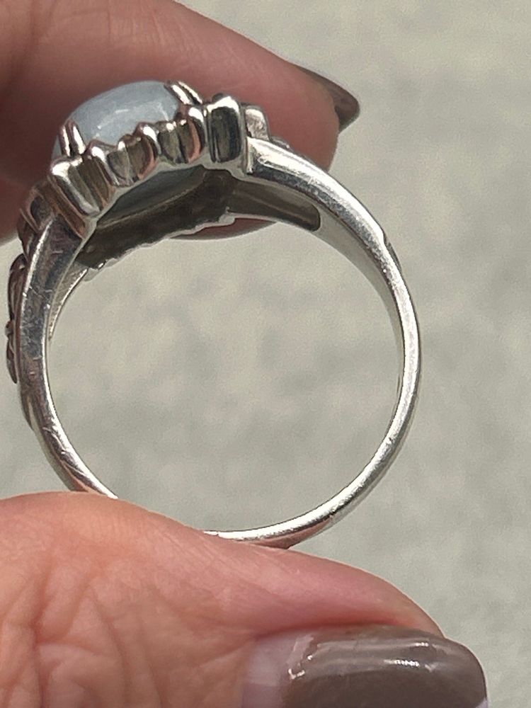 A gorgeous nature-inspired statement ring featuring a soft blue aquamarine cabochon set in solid sterling silver. The gem’s tranquil sky-blue hue is beautifully framed by a bold, hand-crafted floral and leaf motif that wraps elegantly around the band. Substantial in size and presence, this piece blends artisan craftsmanship with timeless bohemian charm — perfect for collectors who love unique gemstone designs and organic silverwork.