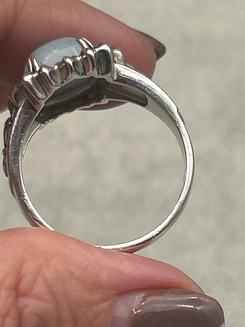Notable Details • Metal: Sterling Silver, marked 925 • Gemstone: Aquamarine cabochon (tested) • Stone Cut: Smooth domed oval cabochon • Setting: Secure prong setting with raised petal frame • Design Details: Leaf and floral pattern shoulders • Ring Size: 11 • Band Width: Approx. 4 mm at back, 15 mm face height • Style: Artisan / Boho / Statement / Nature-inspired • Condition: Excellent — clean silver, smooth polish, natural stone inclusions visible