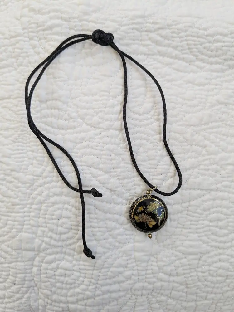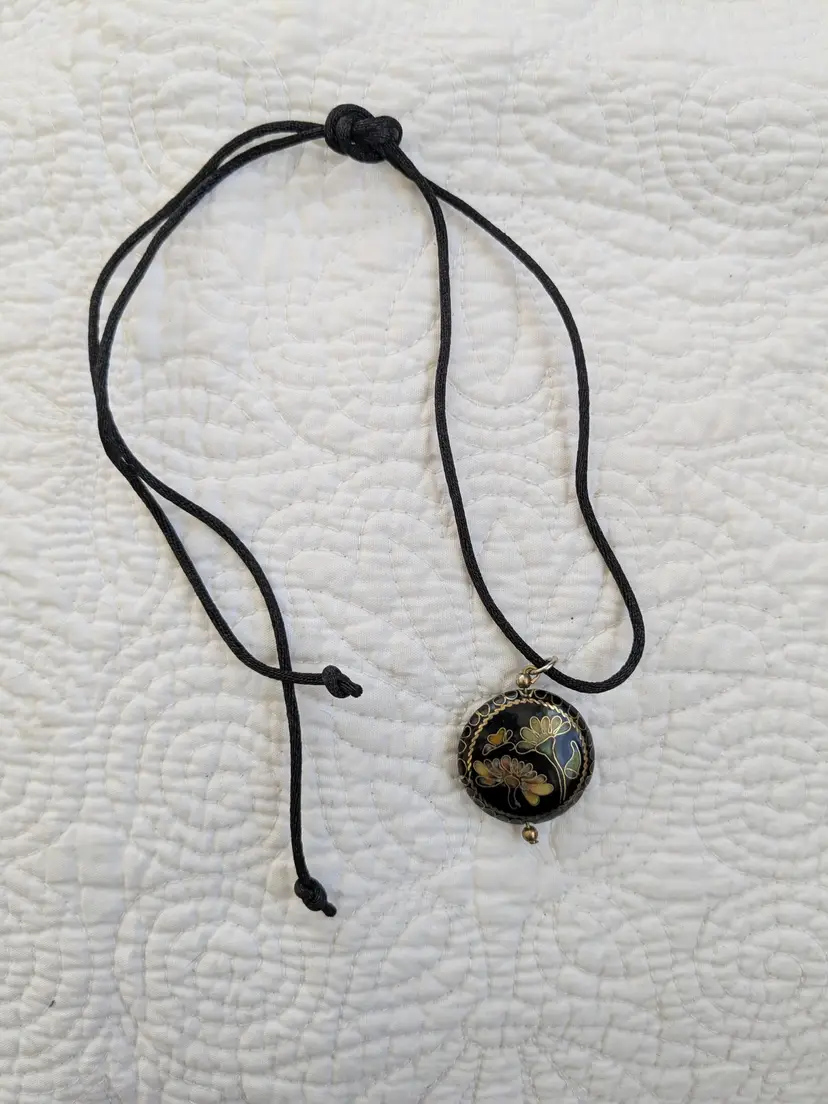Both sides of the necklace have different scenes. 1" across with a 28" cord. Unmarked