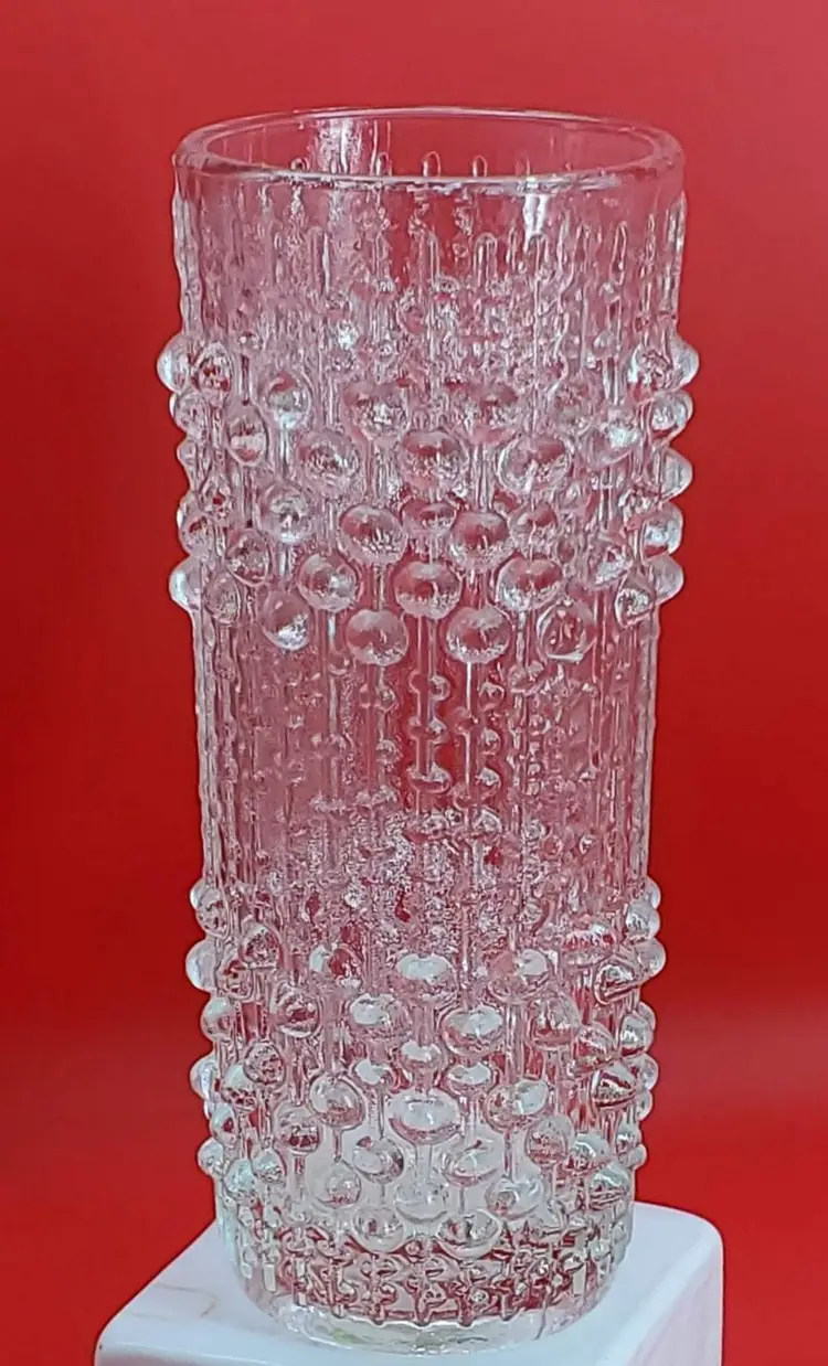This vintage Czech glass vase from Sklo Union features a unique clear glass candle wax design with a 3D effect. Designed by Frantisek Peceny, in 1974, it stands at 7 inches tall.
