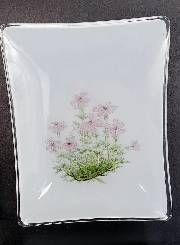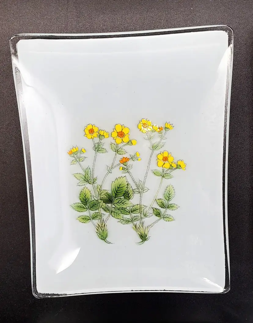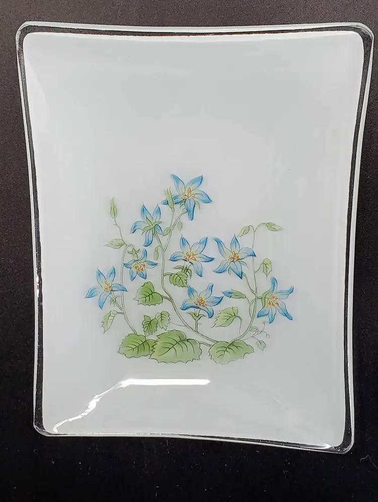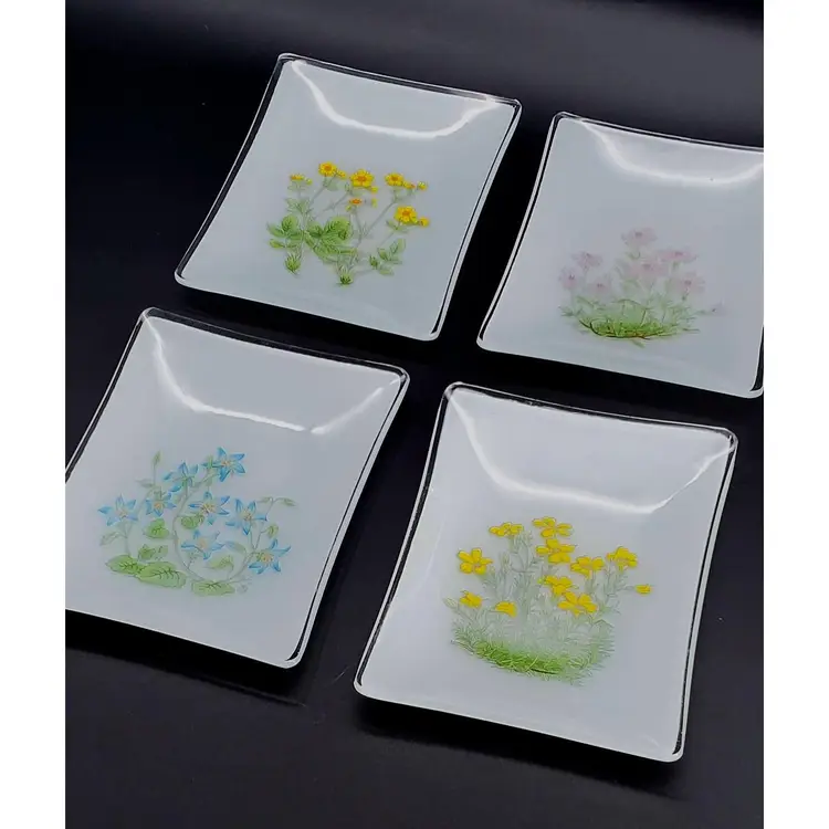 Their frosted and clear glass design showcases a beautiful array of four different flowers, each piece measuring 5.5" x 4.25", perfect as trinket dishes, snack plates, soap dishes, change or tip trays, or just as a pretty decoration.
