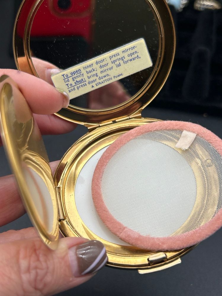 A beautiful vintage Stratton compact from England featuring a double-sided gold-tone design — one side displays a radiant starburst floral pattern, and the other is adorned with a tiny star motif. Inside is Stratton’s signature spring-loaded mirror lid with the original instruction label still attached.