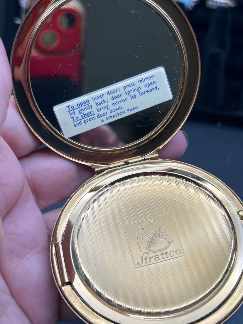 Notable Details: • Brand: Stratton, England • Material: Gold tone metal • Design: Floral starburst front with star pattern back • Size: 3 inches diameter • Marked: Stratton England logo inside • Features: Mirror with instruction label, inner sifter (puff missing) • Condition: See description for details — light surface wear consistent with age, puff missing; hinge and clasp secure.