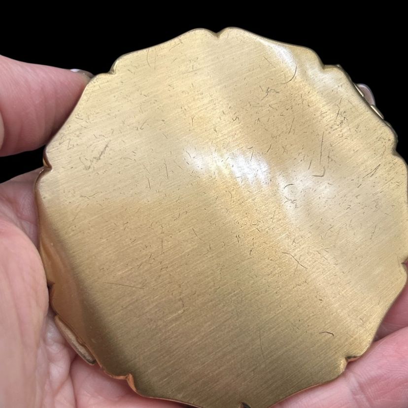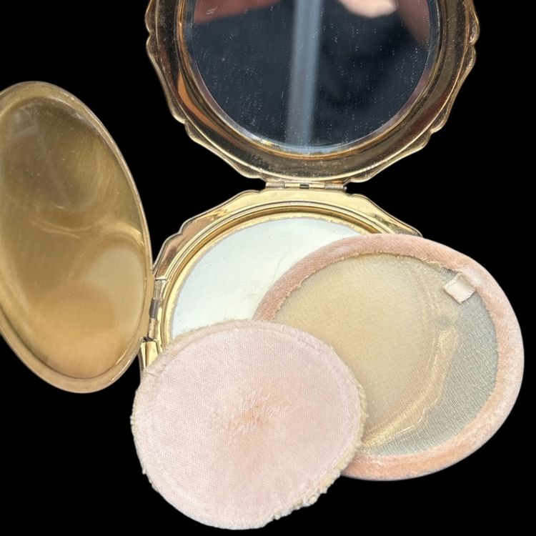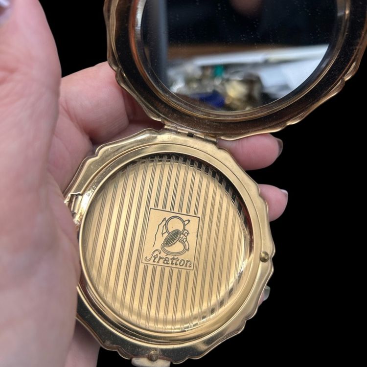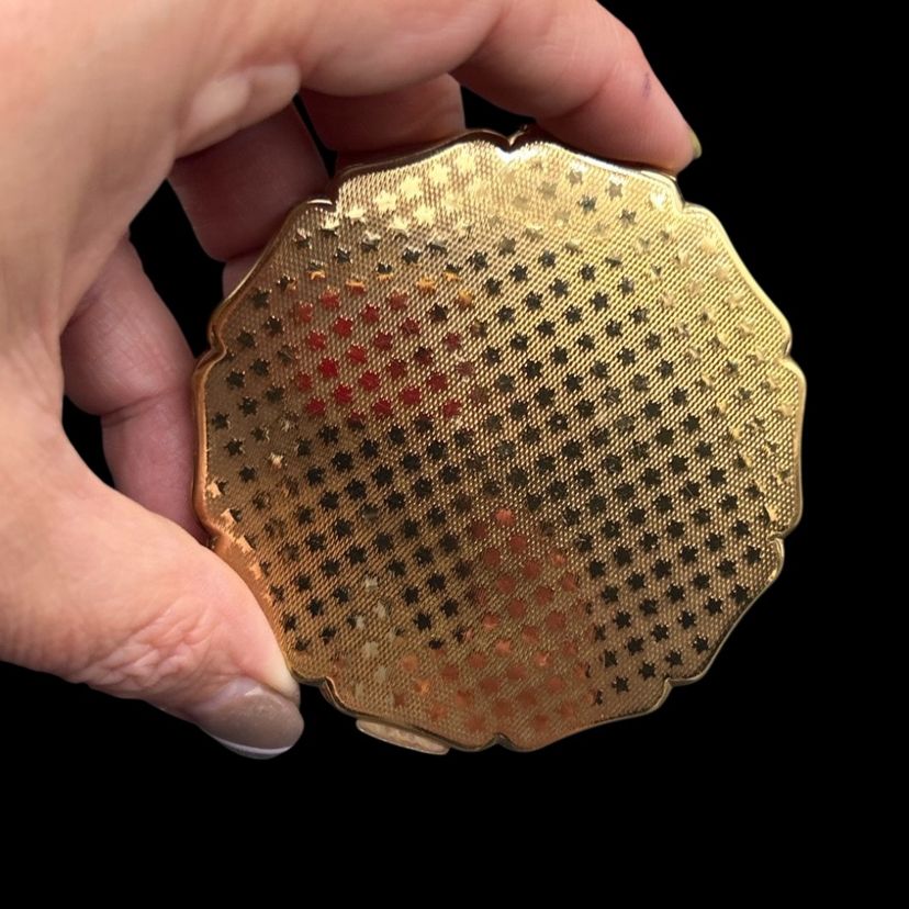 Notable Details: • Brand: Stratton, Made in England • Material: Gold tone metal • Pattern: Starburst with scalloped edge • Size: 3 inches diameter • Includes: Original powder puff and mesh sifter • Condition: Good vintage condition — minor surface wear and light scratches consistent with age; hinge and clasp work properly; mirror clear and intact.