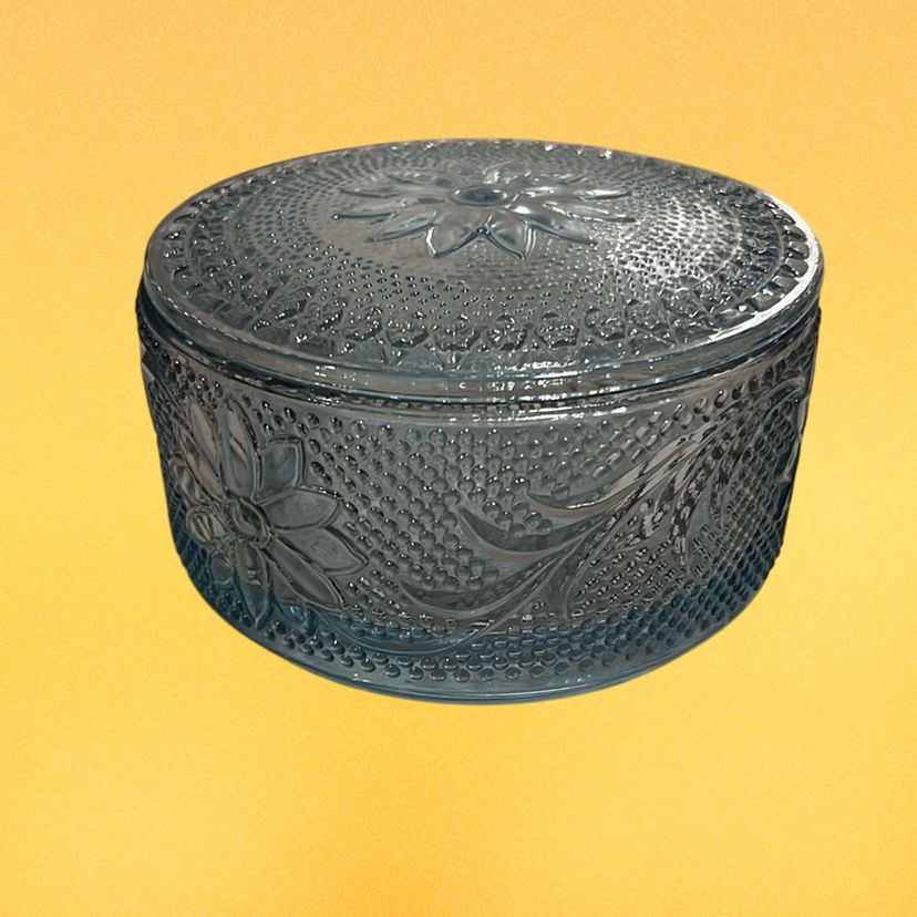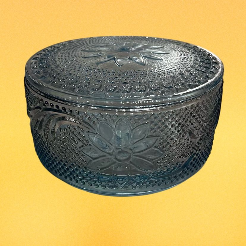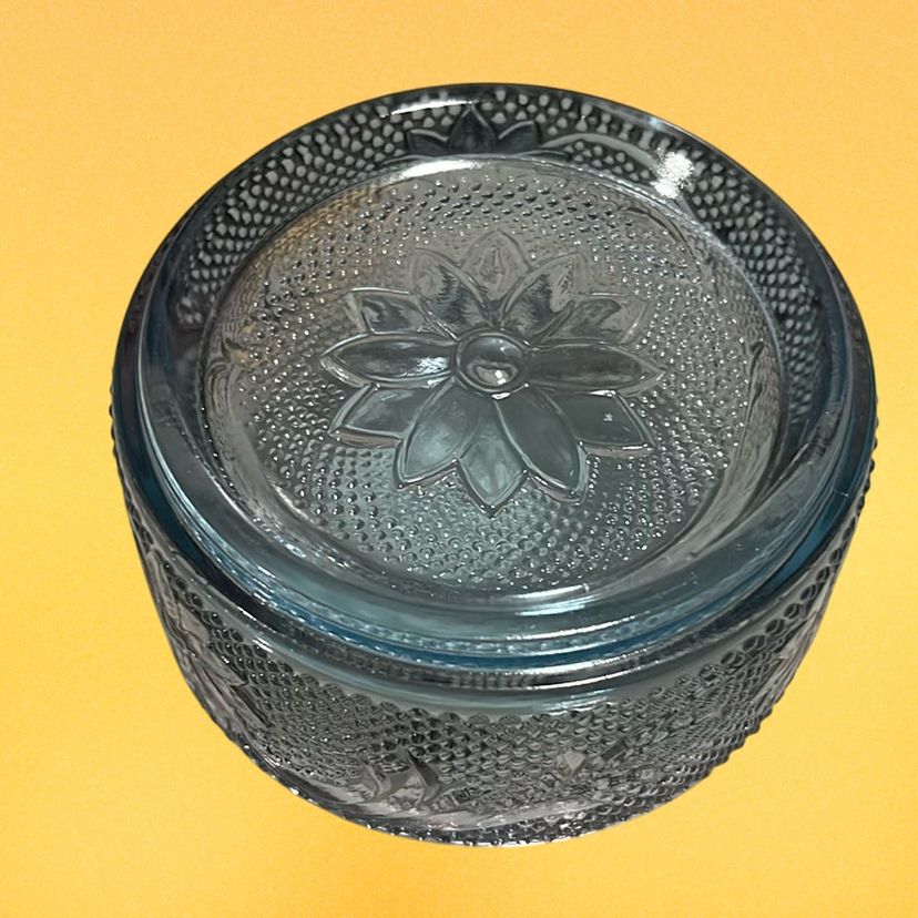 01. Vintage Tiara Sandwich Light Blue Glass Round Puff/Trinket/Storage Box Jar with Lid 2” Tall