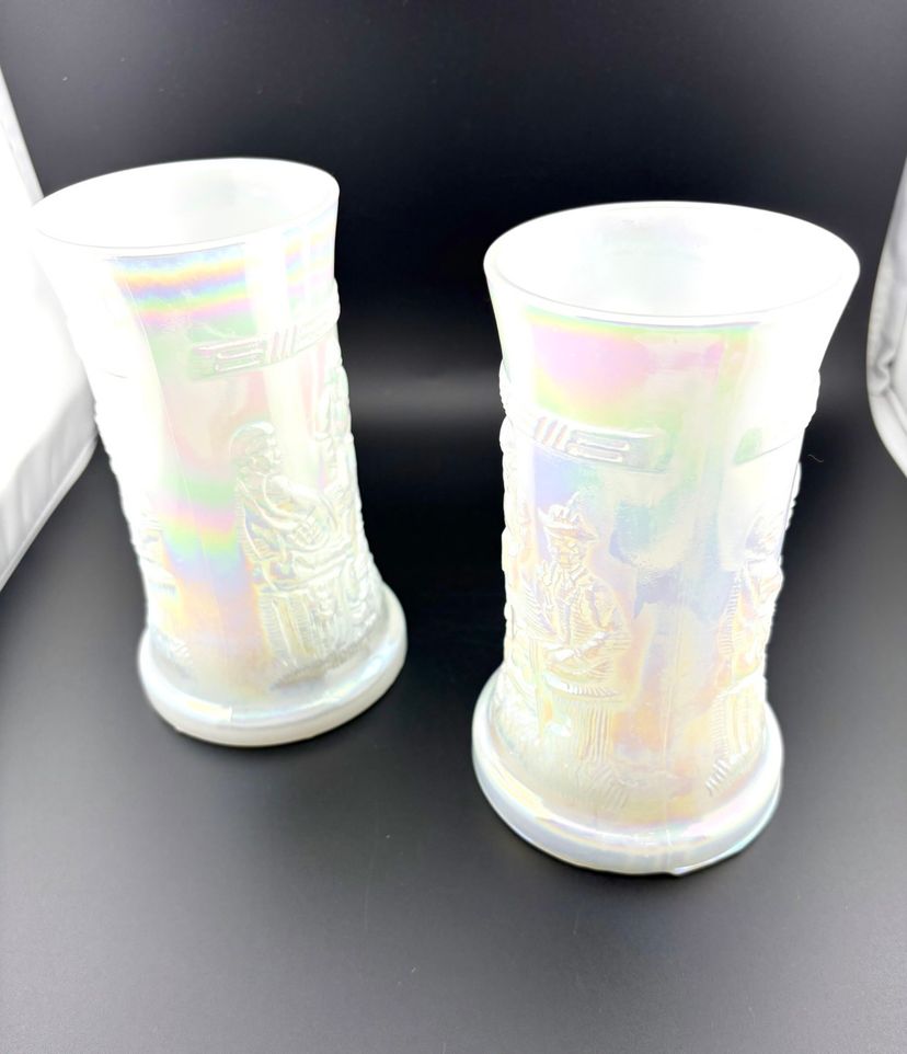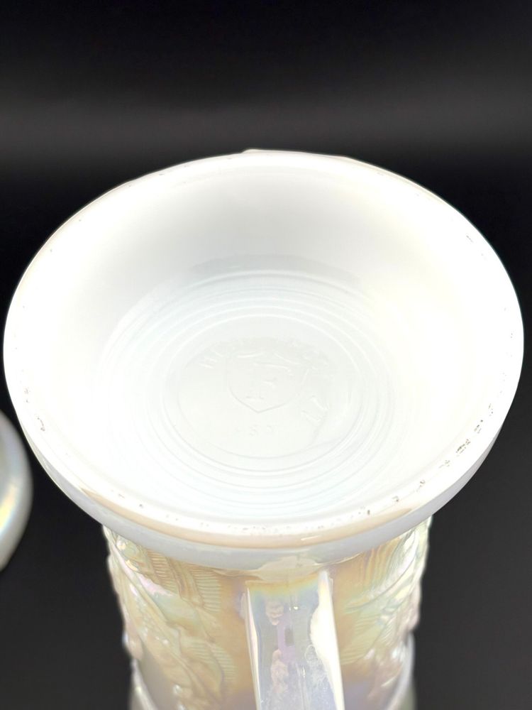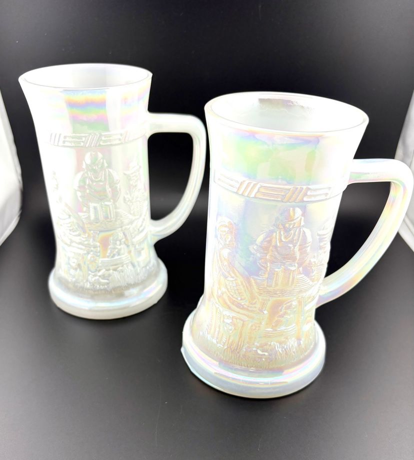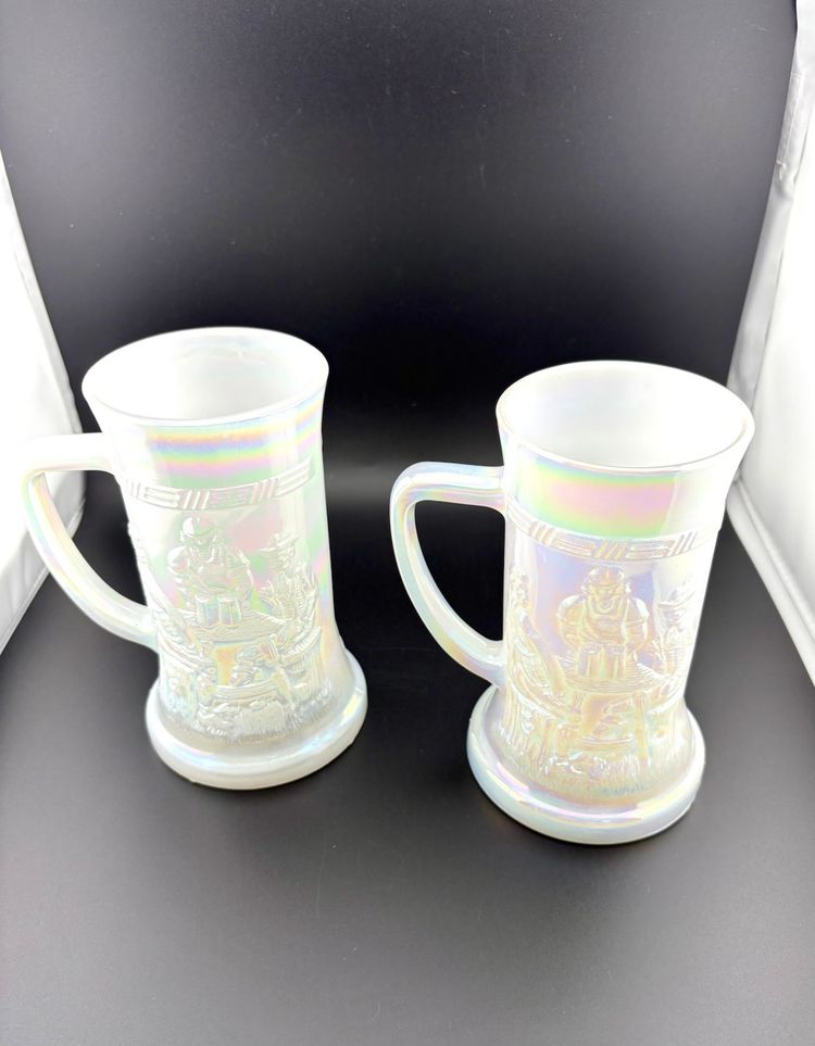 These mugs look like they were never used. They are marked on the bottom heat safe and have a F on the bottom. They are in good condition with no chips or cracks.