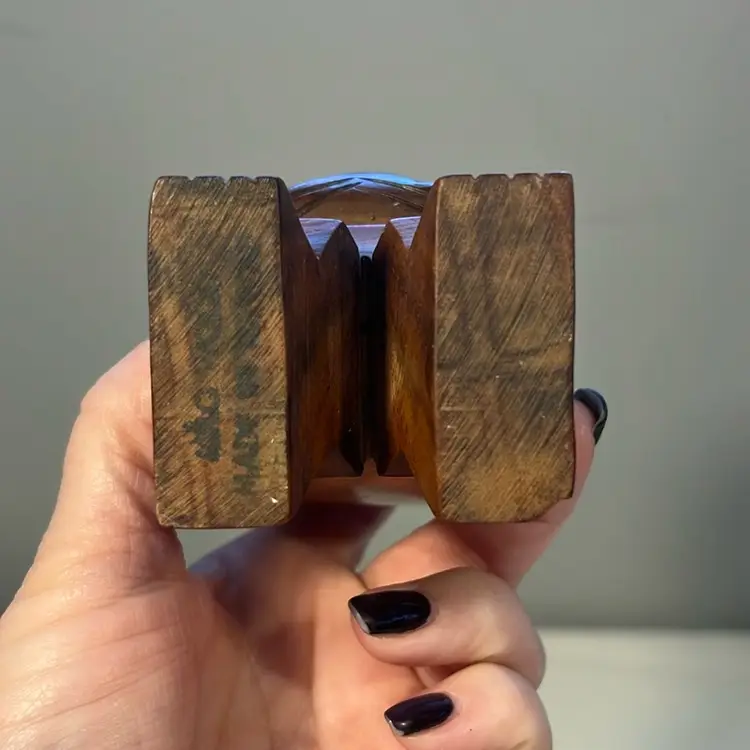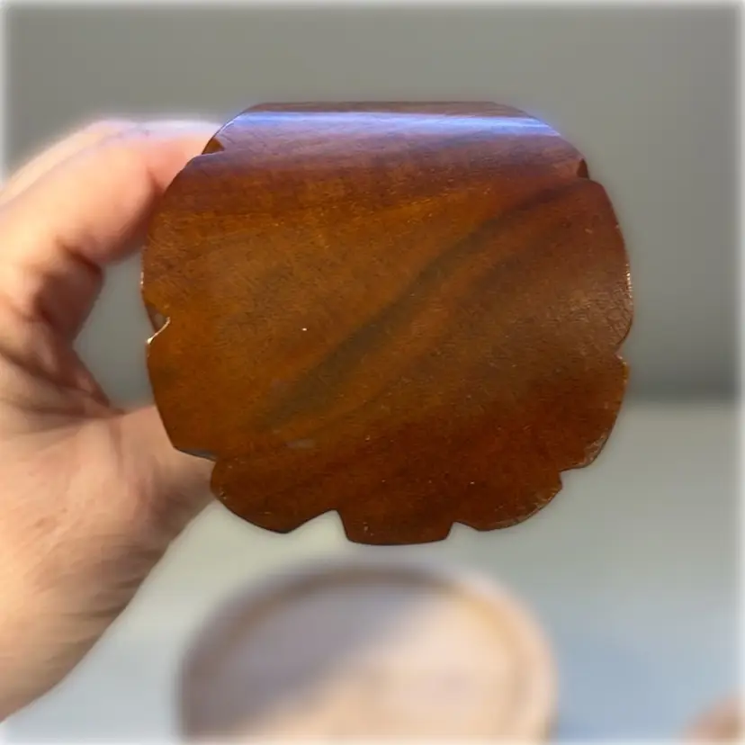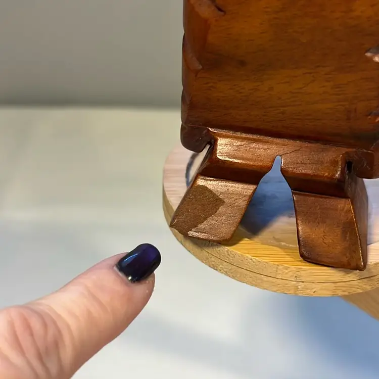 Good condition with minor issues. Small chip in wood on one leg on the back. Approx: 4.25” h