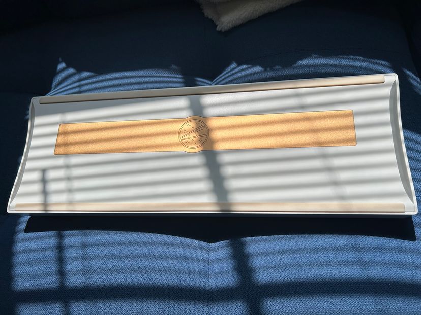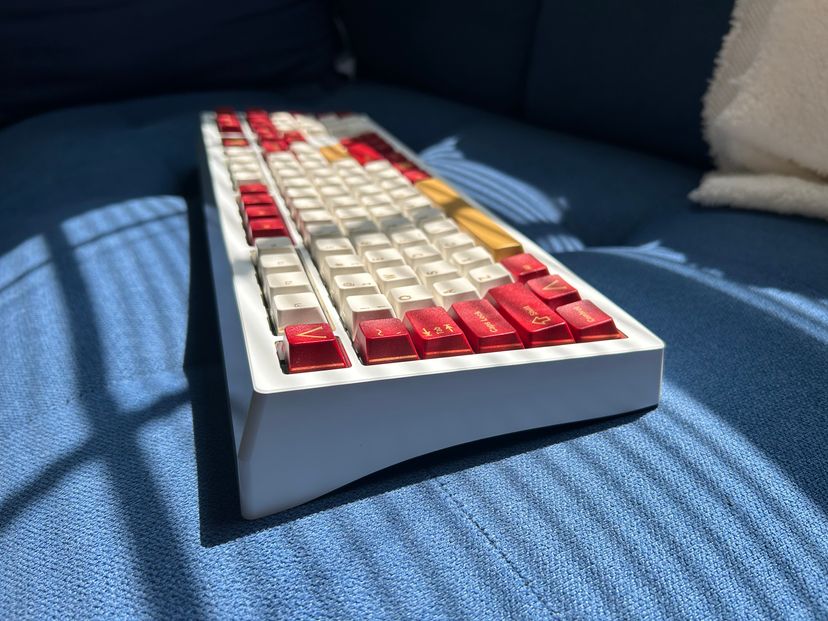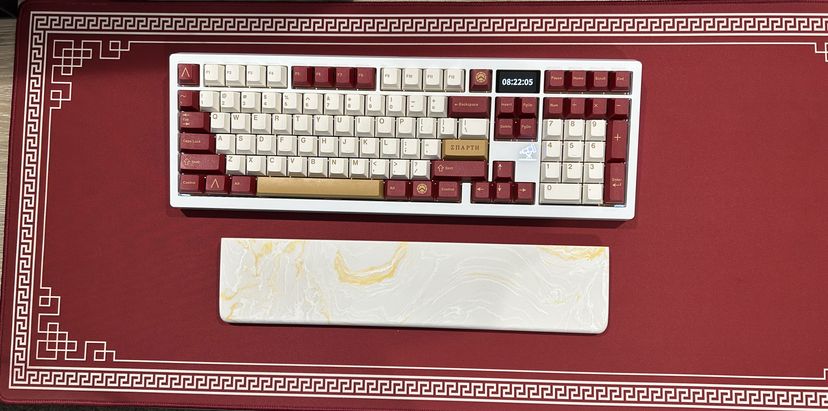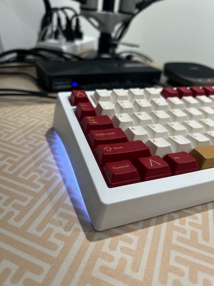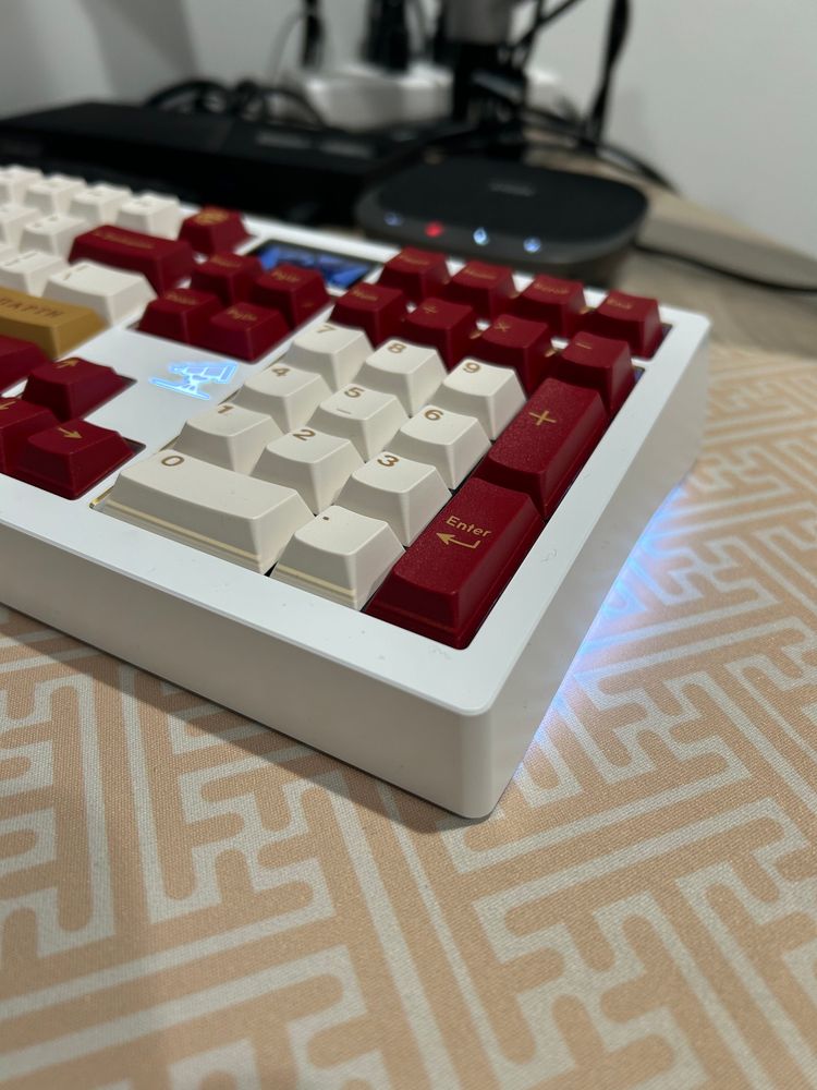 -Color: E-White (SE) -PCB: Tri-Mode Flex Cut -Weight: Anodized Gold -Extra Internal weight -Screen Module -2 Keys Module -Plates: PC, POM, FR4, Alu, CF, Brass -Stabilizers that came with the keyboard are lubed with Krytox 205g0