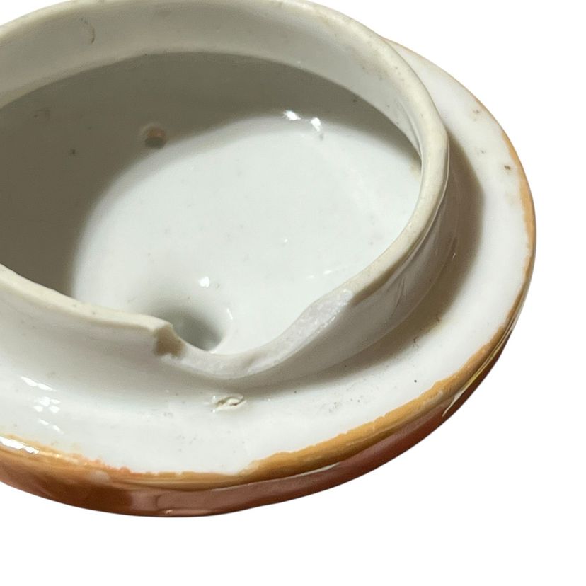 Inside small chip on lid, spout glaze slip
