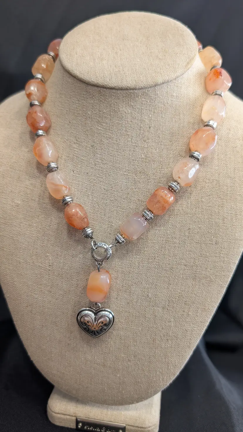 Beautiful Brighton necklace featuring chunky peach agate stone beads accented with Brighton silver-tone spacers. Designed in a flattering Y-style with a delicate chain drop finished with a heart charm. Features multiple Brighton heart details and oval links engraved with “LOVE.” Signed Brighton heart tag at the drop. Soft peach tones with natural stone variation give this piece wonderful warmth and movement.