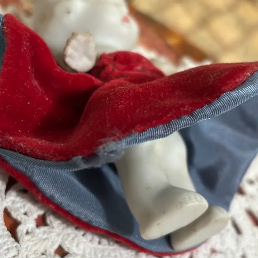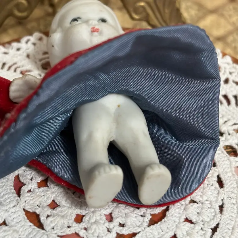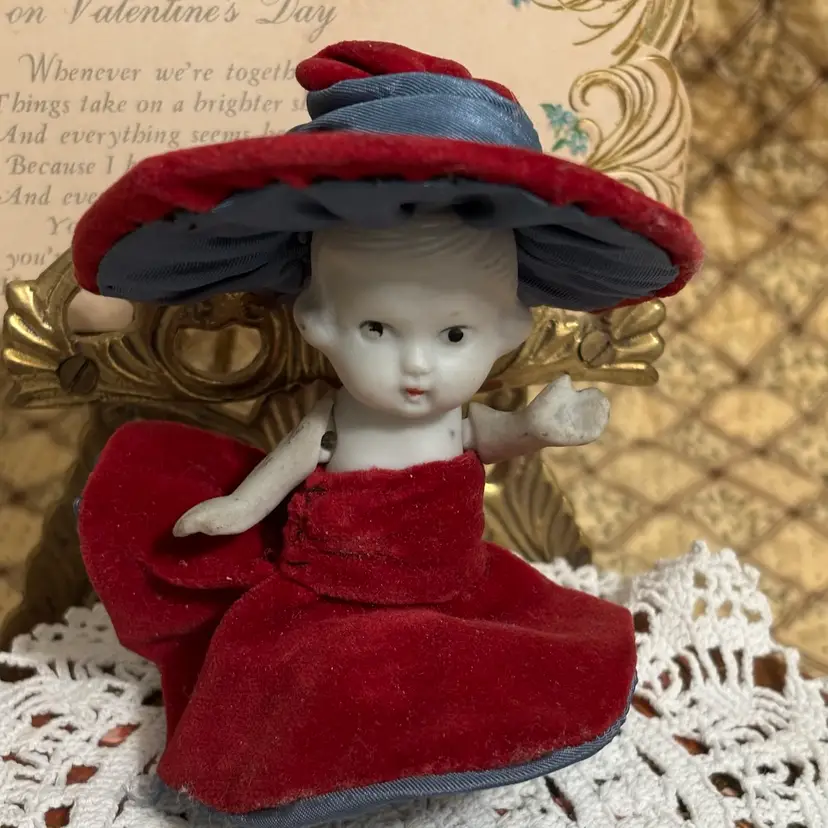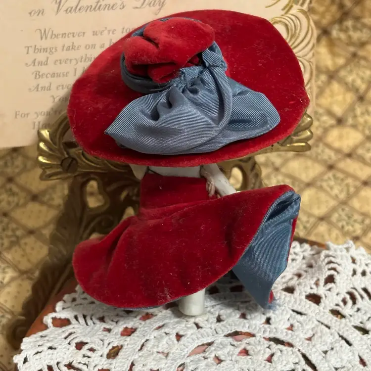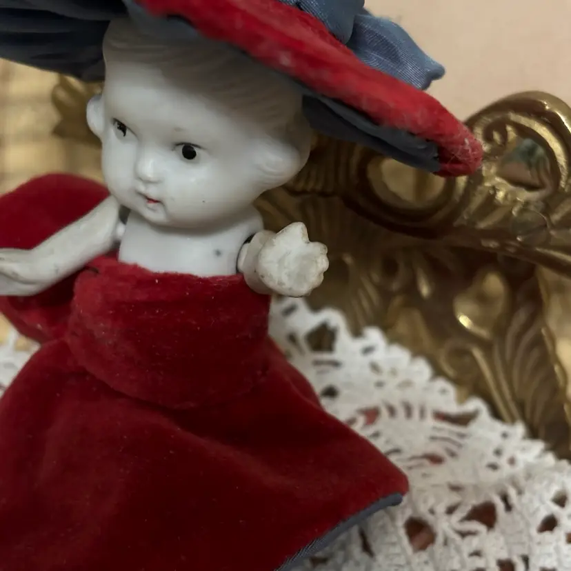 Very cute and she is stylin. Looks like clothes were hand sewn and added. A few minor issues- hat coming apart at seam in one small place and small seam in dress needs repair. Very clean. No chips or cracks in doll.