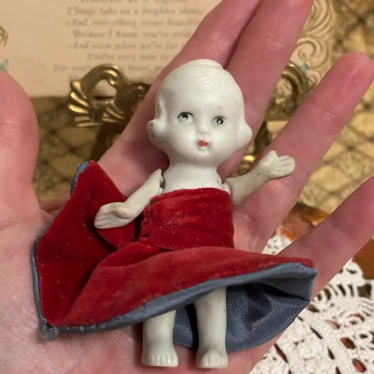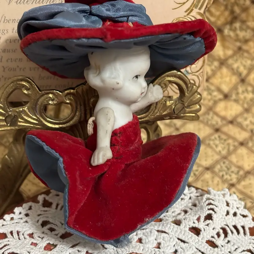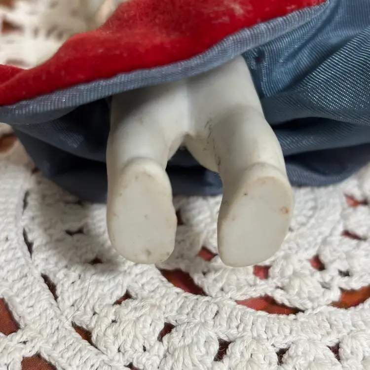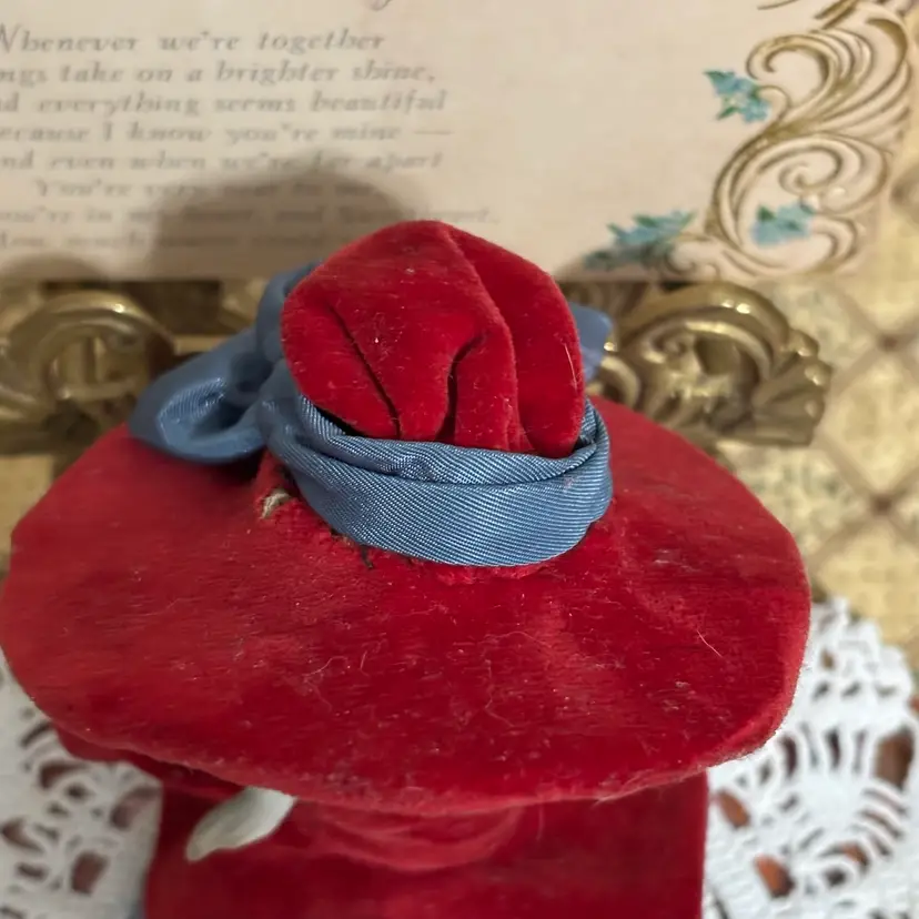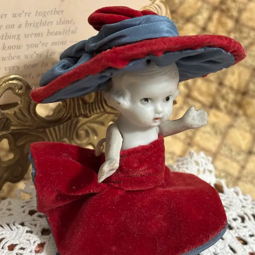 Very cute and she is stylin. Looks like clothes were hand sewn and added. A few minor issues- hat coming apart at seam in one small place and small seam in dress needs repair. Very clean. No chips or cracks in doll.