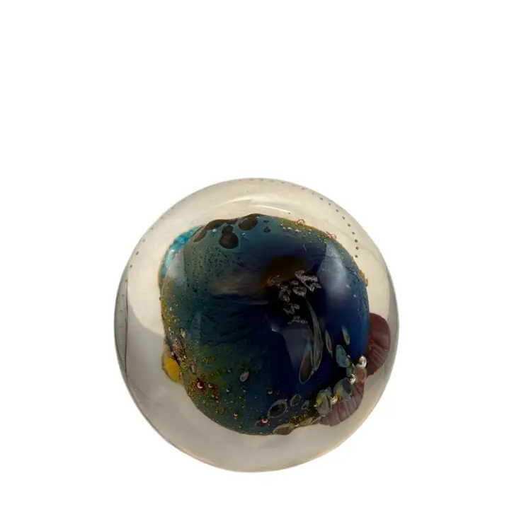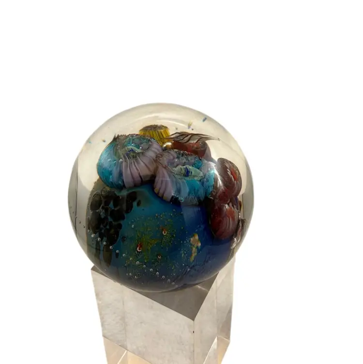 Josh Simpson “Inhabited Planet” Signed Large Marble Paperweight With Base - 2.25”