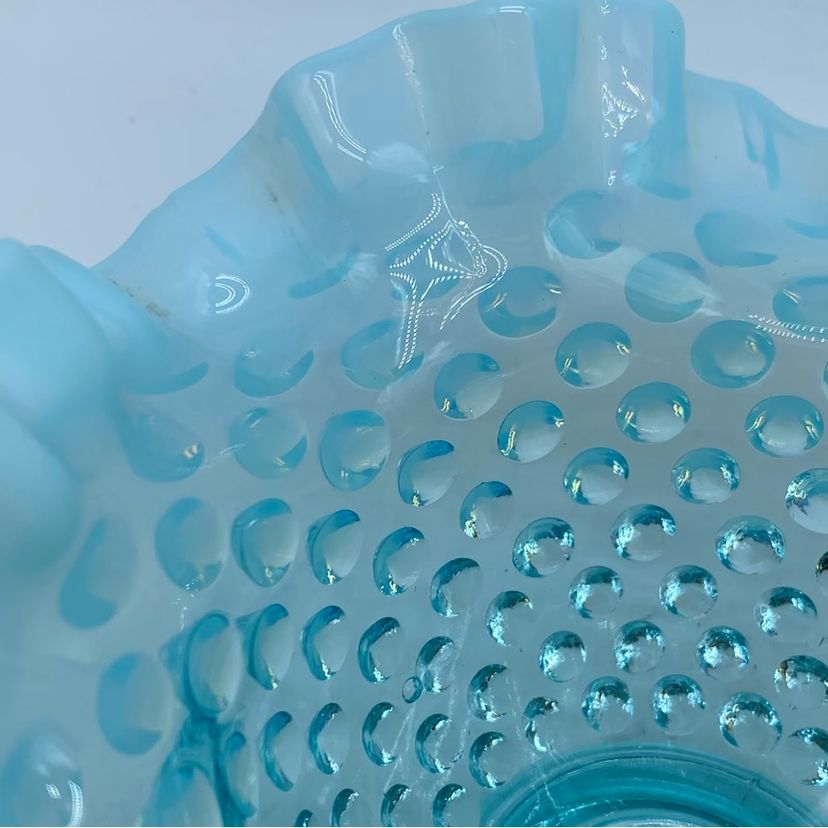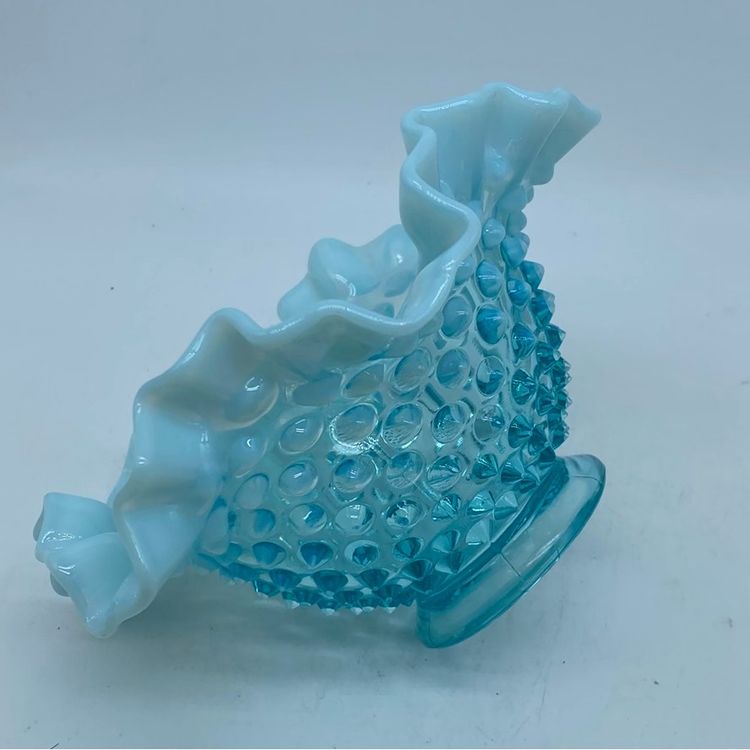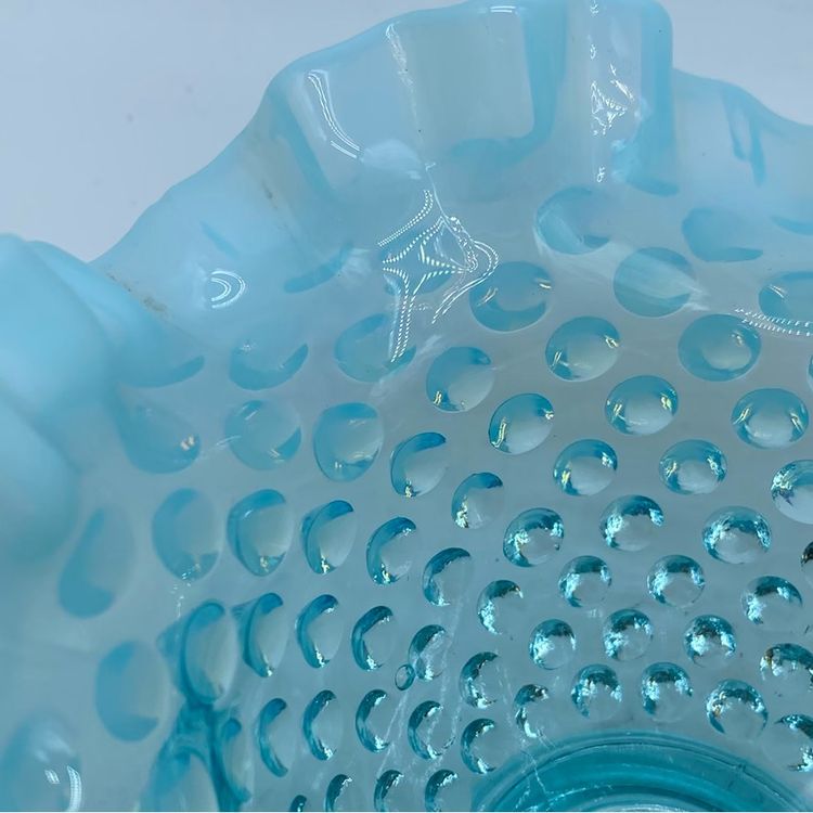Opalescent glass, characterized by its milky white or milky blue appearance, is achieved through a specific cooling process that creates a pearly sheen. The hobnail pattern, combined with opalescent glass, became a signature look for Fenton, highly sought after by collectors for its nostalgic charm and intricate craftsmanship. These pieces are often displayed as decorative accents in homes.
