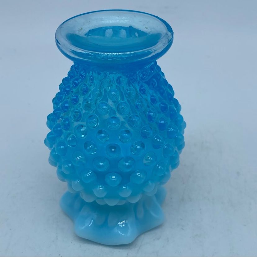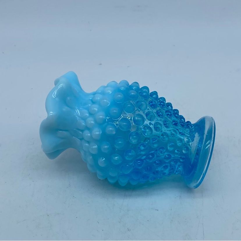 The opalescent hobnail pattern, especially in blue, is a highly sought-after collectible. These vases were often produced as decorative items for the home, showcasing the craftsmanship and artistic flair of American glassmaking during the mid-20th century. Their popularity endures among collectors who appreciate their unique texture and luminous quality.
