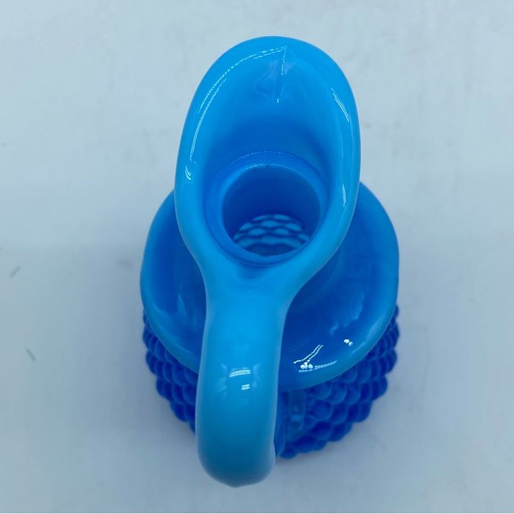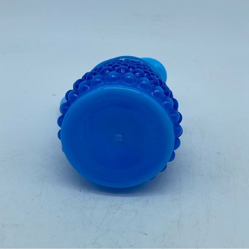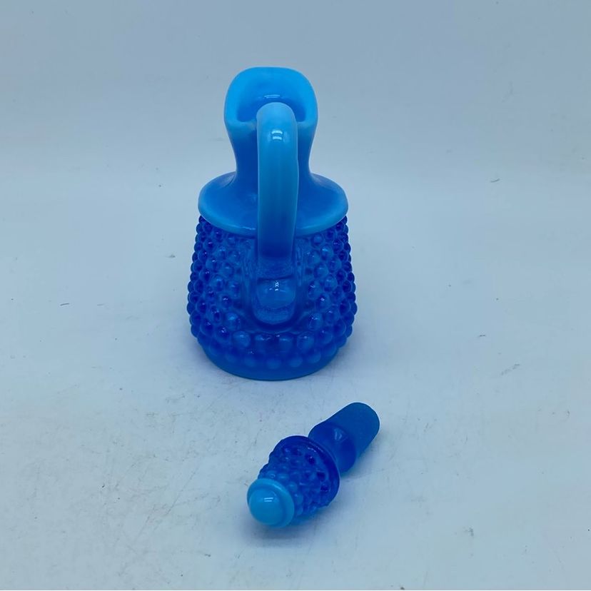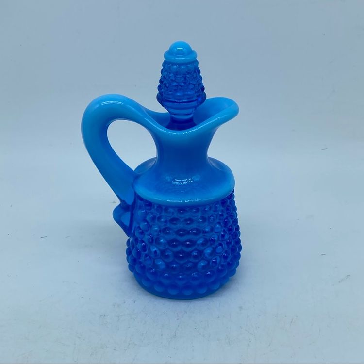 This particular blue opalescent hobnail cruet exemplifies Fenton's popular mid-century aesthetic. The hobnail pattern, characterized by its raised bumps, creates a tactile and visually appealing surface, while the opalescent glass adds a milky, ethereal quality. Cruets like these were often used for serving oils, vinegars, or other condiments, serving both a functional and decorative purpose in the home.