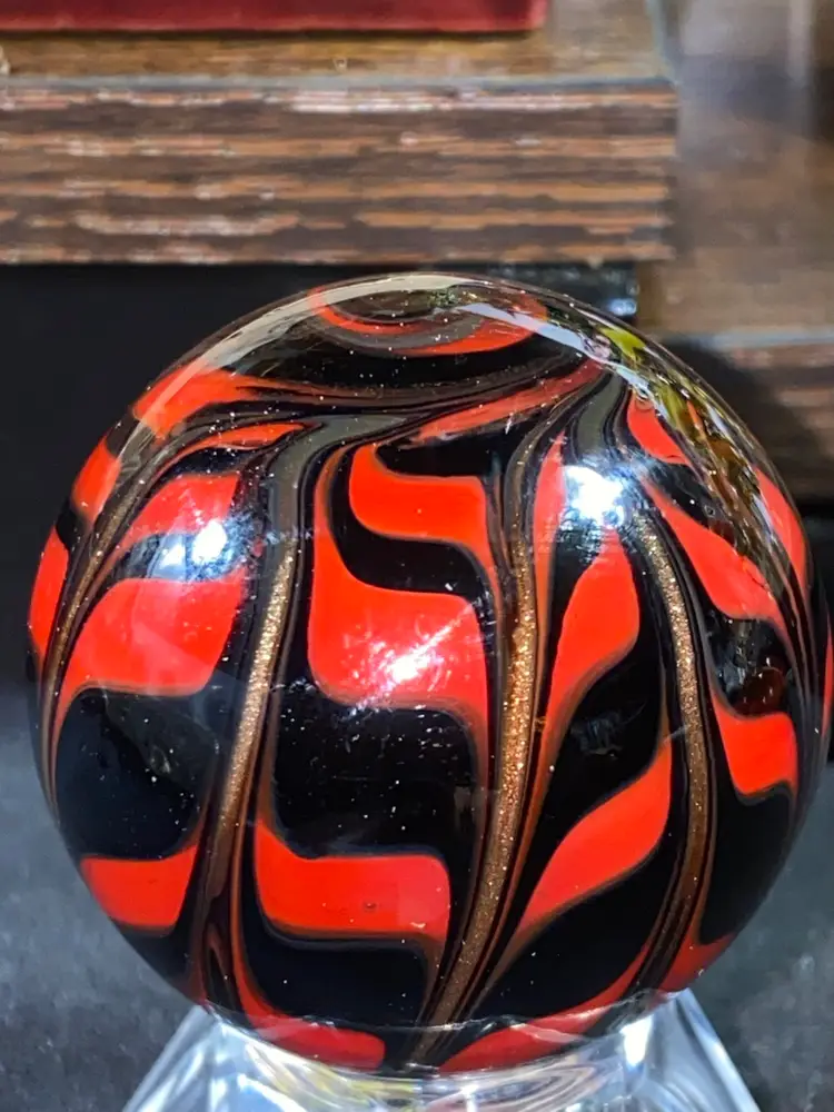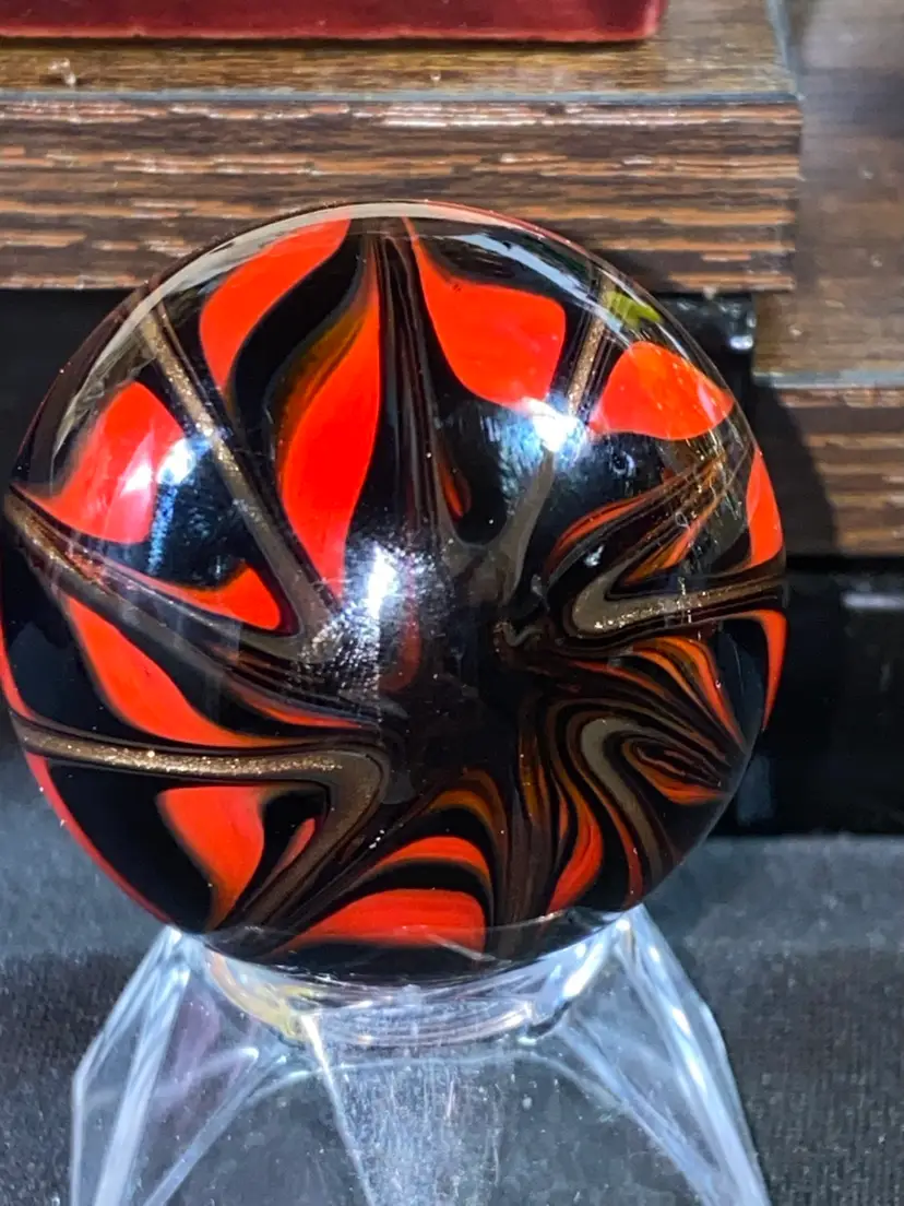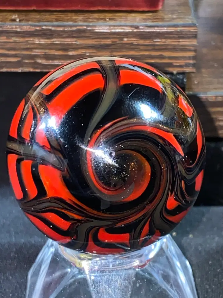 Unknown Maker 1.5" Red And Black Feathered Lutz Marble Front And Back Photos