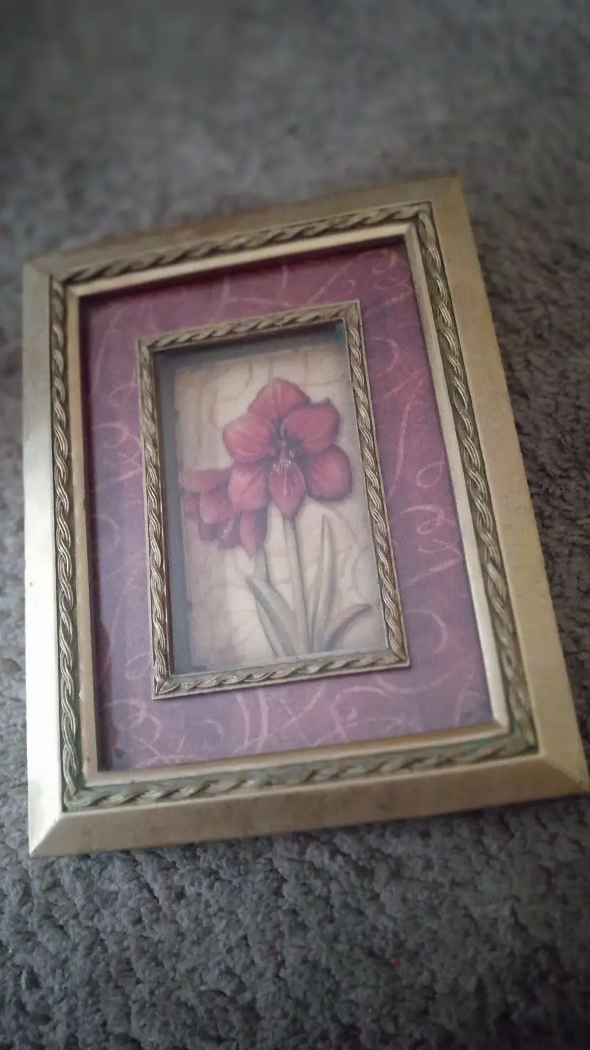 PICTURE HAS BEAUTIFUL PICTURE OF BURGUNDY FLOWERS WITH LEAVES RED DESIGNS AND GOLD TONE FRAME