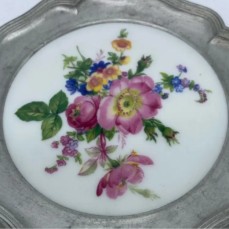 Bavaria, Germany, has a strong tradition of ceramic production, with companies like Schwarzenhammer being known for their decorative porcelain. Combining finely painted ceramics with handcrafted pewter frames was a common practice for creating decorative items, often intended as wall hangings or trivets, during the late 19th and early to mid-20th centuries. These pieces were popular for their aesthetic appeal and the blend of different artisanal techniques.