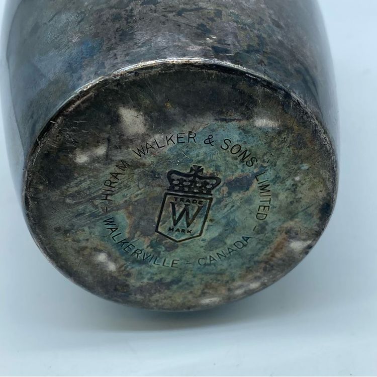 The cork inside cap is in excellent condition. There is a built-in strainer to keep ice inside when pouring. The bottom is marked Hiram Walker Ltd Walkerville Canada. Great lines work with traditional, art deco, modern decor. EP Copper means electroplated silver over copper, and I believe that the BM Mounts means that the mounted pieces (the foot around base and the handles) are made of britannia metal.