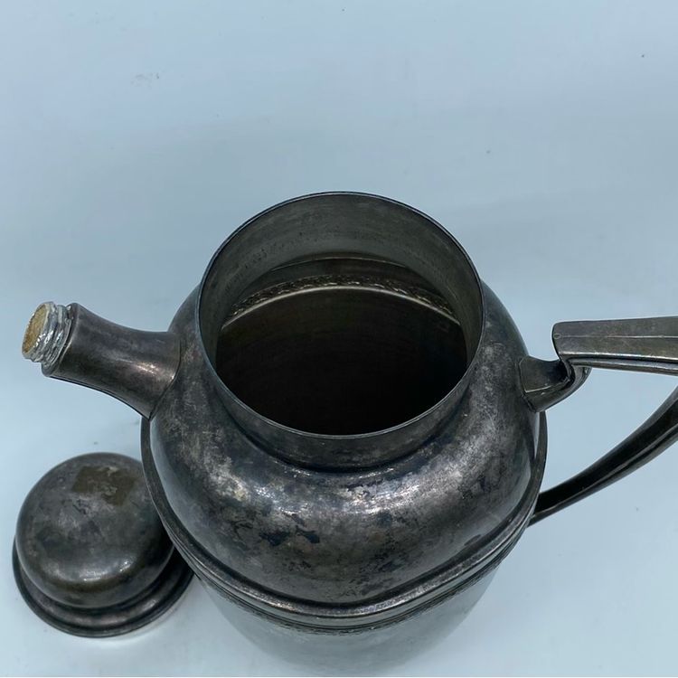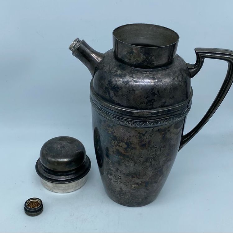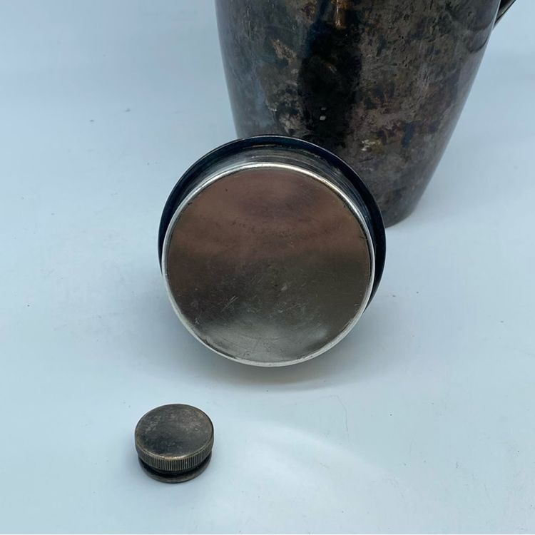 1940's Hiram Walker Plate Silver electroplated over copper classic cocktail shaker. This is a great old item in terrific condition. The shaker stands 10" tall with the cap in place, 7" across spout to handle. The cap fits tightly to allow mixing of contents without spilling. The spout has a screw-on cork-lined cap for the same reason, it also keeps things chilled for a good while as it is quite heavy 0.8kg/1lb 14 oz).
