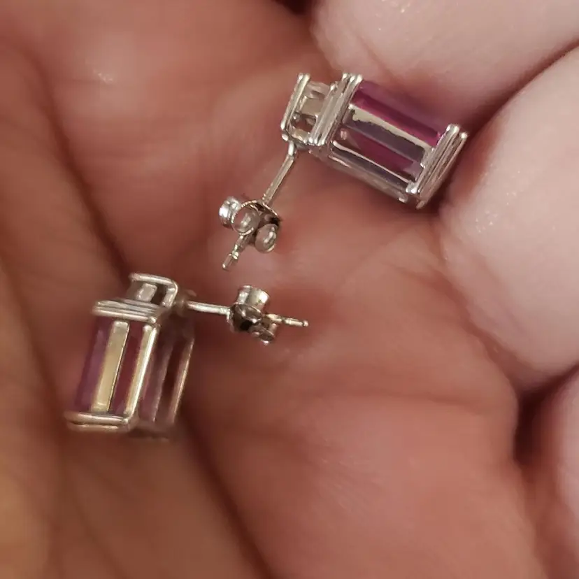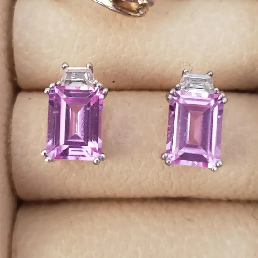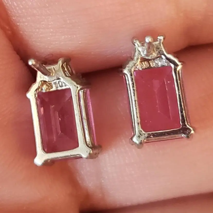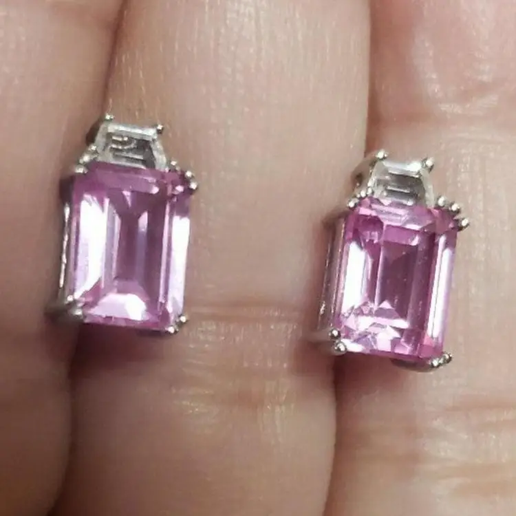 10k Solid White Gold* Emerald Cut Pink Topaz with white Topaz above* Earrings and posts are stamped 10k with makers mark* Does not have original backings but sending with sterling silver backings* 7.5mmx5.5mm Pink Topaz in each earring*