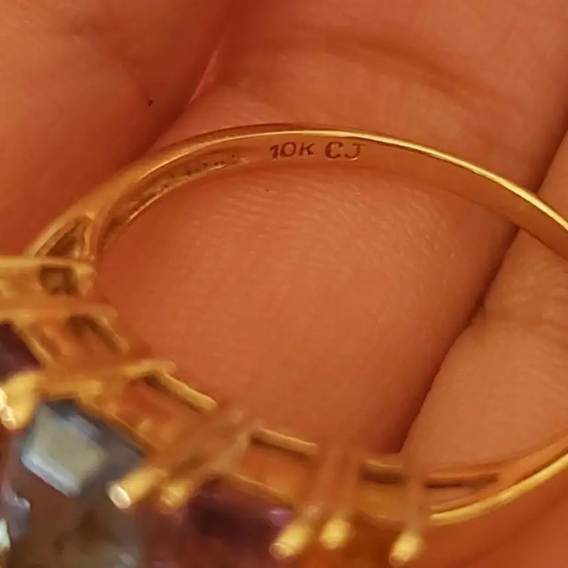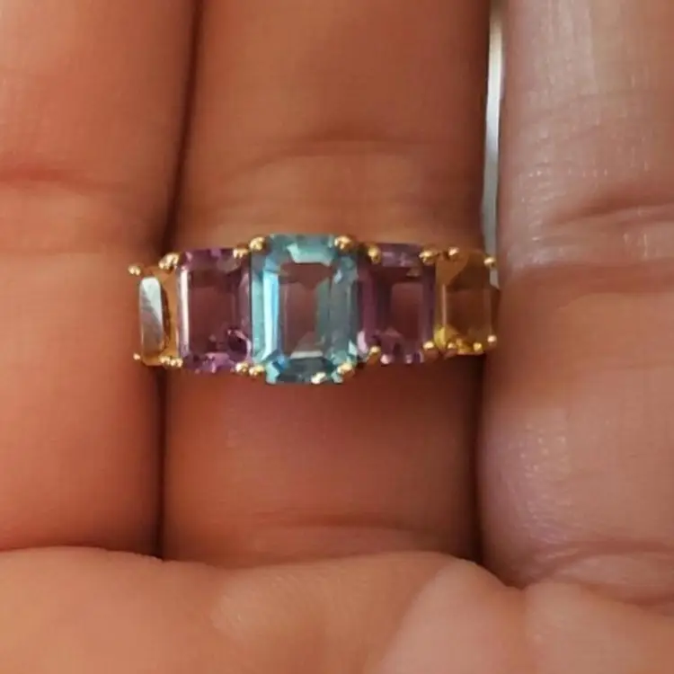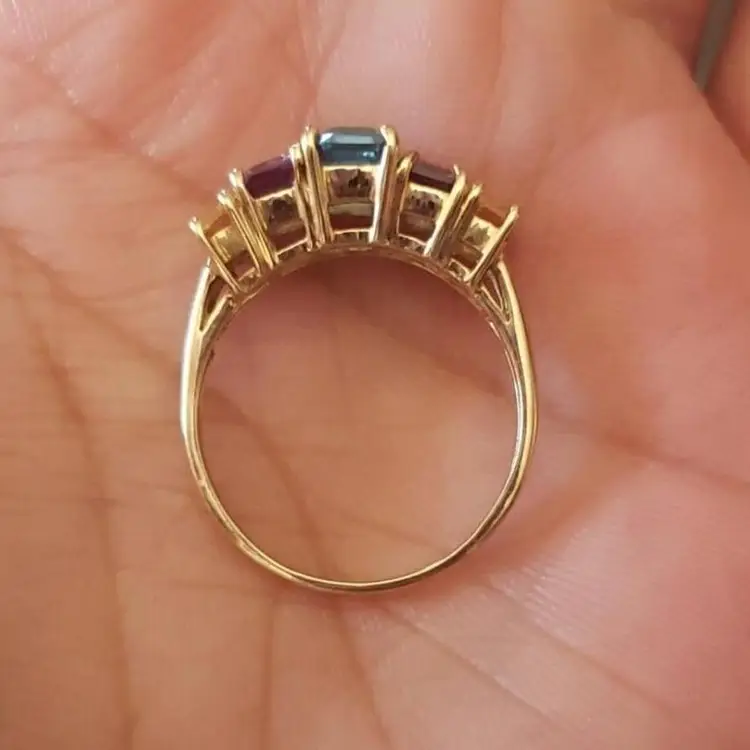 vintage 10k solid yellow gold 5 stone ring* stamped 10k CJ Thai* Emerald cut Blue Topaz, Amethyst, & Citrine* size 8* wear/ scratches on band*