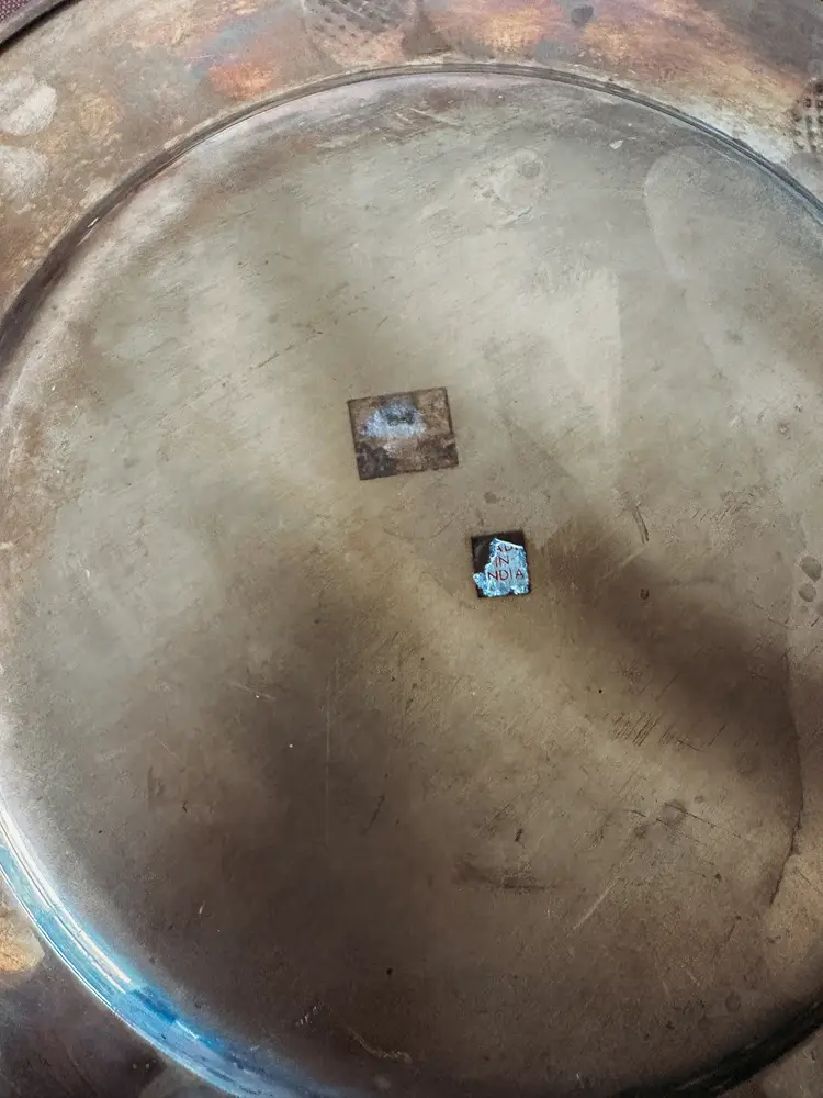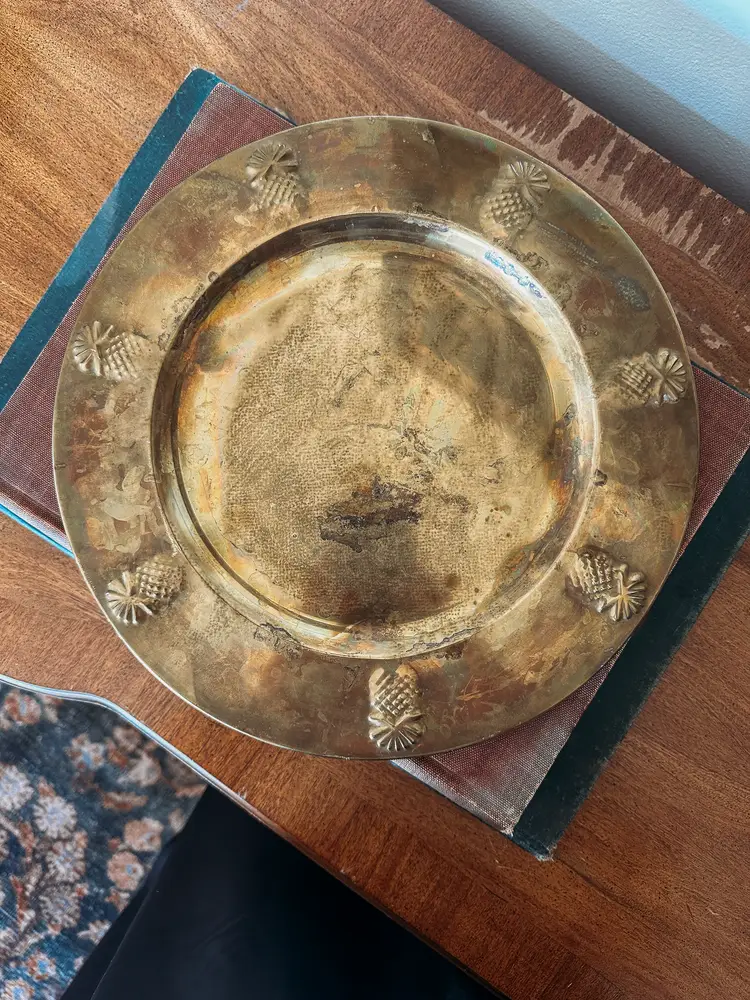 Brass, made in India. Raised Pineapple detail around the edge. Would look great hanging on a wall, displayed on an easel or used as a decorative or serving tray!